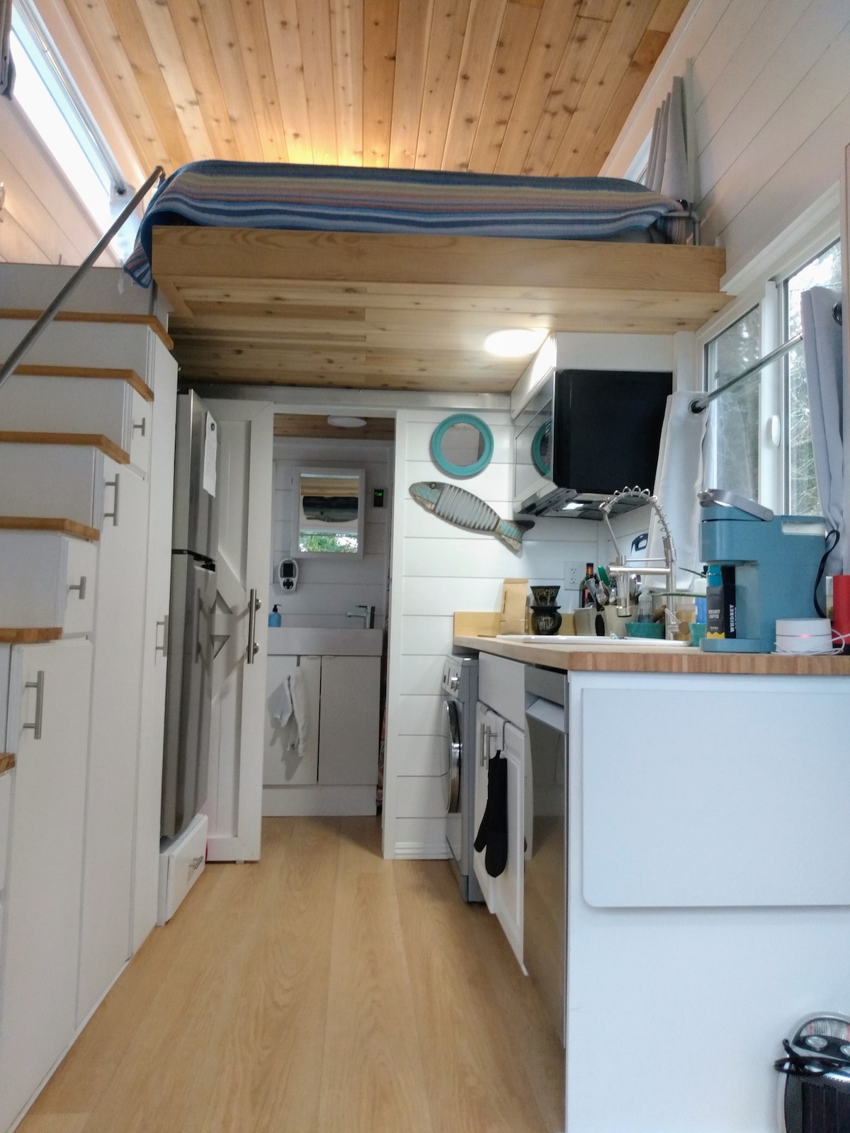 Esta casa muito pequena totalmente equipada sobre rodas fica em um lote à beira-mar com vista para o porto de Holmes. O navio branco e os tetos de madeira expostos dão a esta pequena casa uma sensação de praia. Sente-se em seu pequeno deck com vista ou relaxe lá dentro e desfrute de vistas do pôr do sol através das árvores. Temos focas no porto de 5 milhas de comprimento e uma visita muito ocasional de uma baleia. As águias se aninham na propriedade. Há uma praia pública e lançamento de barco a apenas 2 milhas da estrada no Freeland Park.