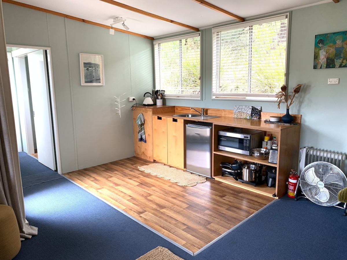 Beloved cabin on the edge of the National Park. The Park starts where the deck ends. 100m to the beach on a direct bush track. You can hear the waves from bed, and with no buildings or streetlights between you and the park, the sky is a wonder at night. Perfect base for exploring or staying in. Uninterrupted views of the mountains, cosy living area with warm lighting and an efficient wood fire, simple kitchen, sunny bedroom, and a deck with a clear view of the mountains you've just climbed.