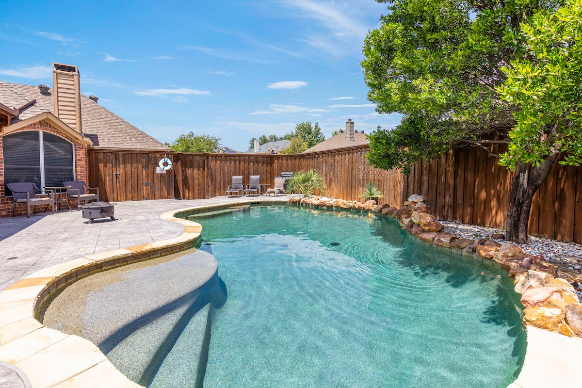 Bem-vindo ao seu pátio ao ar livre e oásis de piscina! Relaxe com amigos sob o grande pátio coberto, assista ao seu evento esportivo favorito à beira da piscina em uma Smart TV de 55 polegadas e churrasco depois de um dia ao sol. O quintal é muito privado com cerca de privacidade de 8 pés. Você não vai querer sair deste espaço ao ar livre, mas se você precisar, estamos localizados convenientemente fora de 121 a poucos minutos de: Stonebriar Mall, Dr Pepper Stadium, The Star, Legacy West, The Grandscape e Toyota Headquarters.