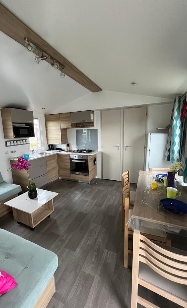 Grand mobile home neuf de 2025, avec wifi, capacité 6 personnes (une chambre parentale, deux chambres avec chacune 2 lits simples), deux salles de bain et 2 wc. Un grand canapé velours marine très confortable vous accueille, un espace repas à l'intérieur et un autre sur la terrasse couverte vous permet d'être dedans/dehors et de profiter de tout l'espace au calme. Les équipements sont de qualité, dans des tons neutres et élégants, avec en prime un superbe jardin paysagé et 2 places de parking.