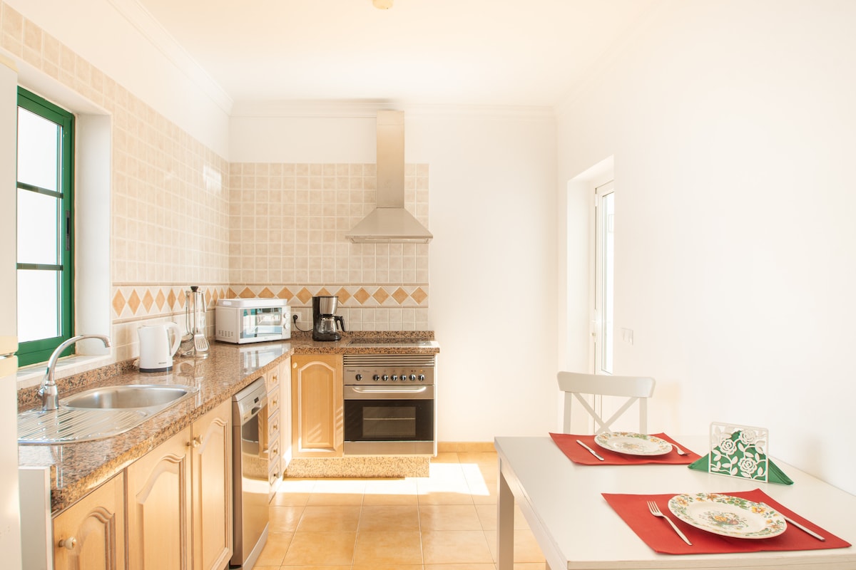 Moradia independente e privada de três quartos num único piso. Tem ar condicionado e duas casas de banho. A menos de 10 minutos a pé da praia e do centro da cidade. Estacionamento gratuito ao ar livre. A moradia oferece um terraço com uma piscina privada, toalhas, um jardim, uma churrasqueira e um solário. Wi-Fi de alta velocidade gratuito e uma televisão inteligente para aqueles que desejam manter-se ligados durante as suas férias. Cozinha totalmente equipada com placa de indução, forno, frigorífico, micro-ondas, máquina de lavar roupa, máquina de lavar louça, etc.