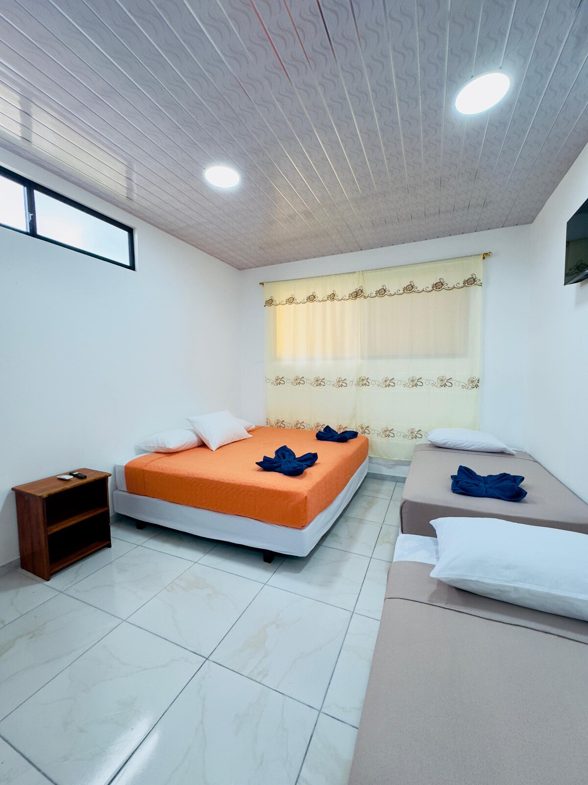 Cómoda recámara familiar para hasta 4 personas, ubicada dentro de un hotel en Galápagos. Cuenta con una cama matrimonial y dos camas sencillas, ideal para descansar después de un día de playa o tours. Acceso a áreas comunes como piscina y patio. Buena ubicación, cerca del mar y de puntos de interés. Ideal para familias o grupos pequeños.