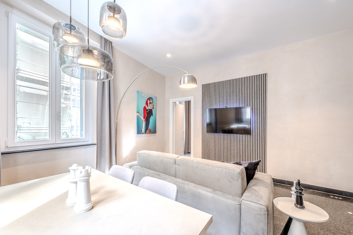 Apartamento elegante e luminoso Com vista para a Piazza Matteotti central Em frente ao famoso Palazzo Ducale Composto por: -1 sala de estar de espaço aberto distinta com sofá-cama confortável e teto com afrescos alto -1 área de jantar elegante com mesa e cadeiras de designer -1 cozinha moderna com todos os confortos -1 quarto duplo localizado no mezanino com vista para a sala de estar também iluminado pelas 3 janelas majestosas -1 casa de banho moderna completa com chuveiro de vidro