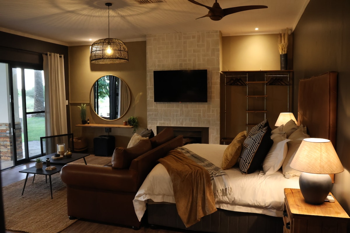 Bem-vindo (a) ao nosso luxuoso retiro Game Farm! Situado no meio da natureza selvagem, o nosso Main Lodge possui 5 quartos acolhedores com casas de banho privativas, uma cozinha totalmente equipada e amplo espaço de estar. Relaxe em grande estilo com duas áreas de varanda exterior, um bar e uma mesa de bilhar. Conecte-se com a natureza em passeios de caça e contemple mais de 35 espécies de vida selvagem. Unidades adicionais oferecem privacidade, acomodando 16 hóspedes no total. Delicie-se com os serviços de chef, um spa pop-up e noites junto à lareira nas nossas duas obras espaçosas.