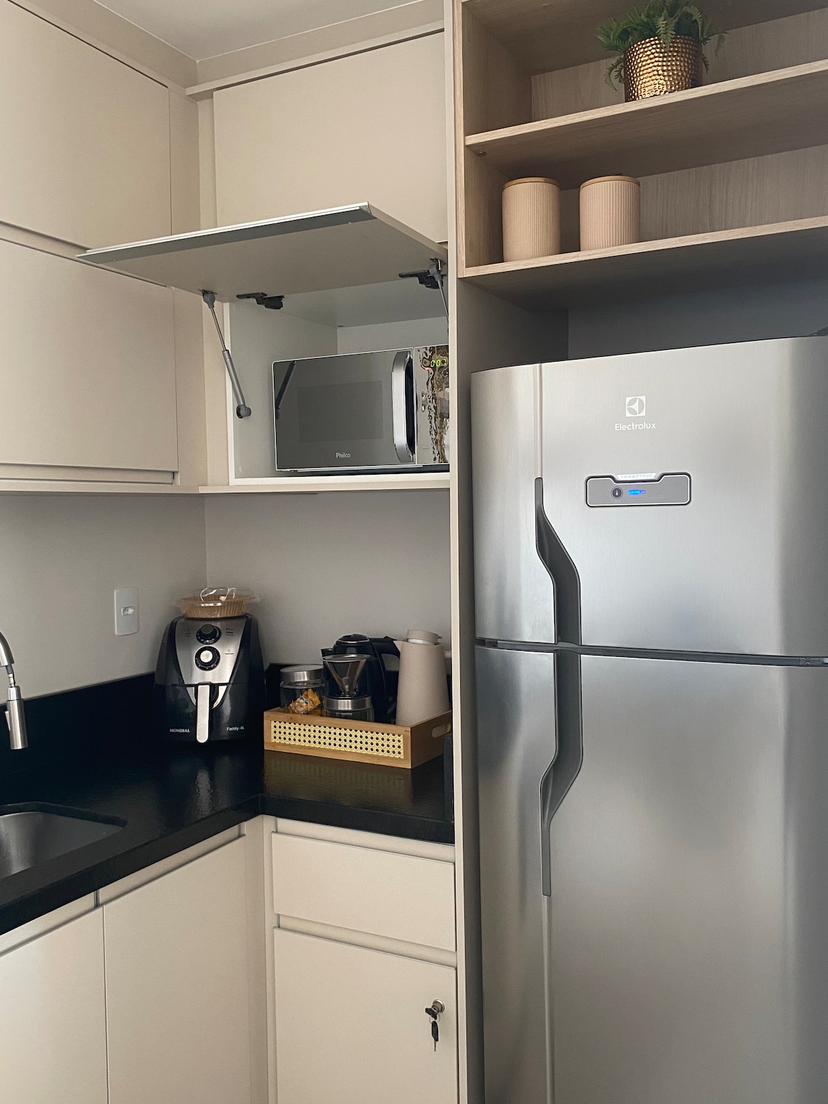 Loft - studio, similar à hotel, com comodidades de uma casa. Disponibilizamos roupas de cama, mesa e banho. Cozinha completa, com fogão por indução, air fryer, microondas, sanduicheira, frigobar, sugar, dentre outros. Local com ar condicionado quente e frio, Televisão com principais aplicativos. Poltrona para leitura. Área externa com máquina de lavar e churrasqueira, bem como uma vaga de estacionamento. Aceitamos pet, mediante consulta, regras e taxa.