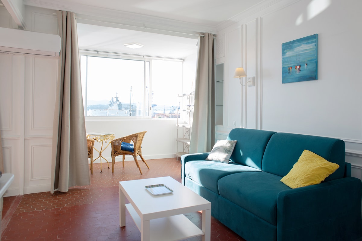 Lindo apartamento de 50m2, com Wii fi no 1º andar pequena varanda com vista para o mar no Porto de Mourillon perto das praias - o apartamento está totalmente equipado: com geladeira e freezer, louça, máquina de lavar roupa, máquina de lavar louça, placa elétrica, torradeira, aspirador de pó, sala de estar com ar condicionado com sofá de TV de tela plana, um quarto com ar condicionado separado - o banheiro e o vaso sanitário no mesmo quarto foram reformados - todos os quartos têm vista para o mar - Os lençóis e toalhas são fornecidos