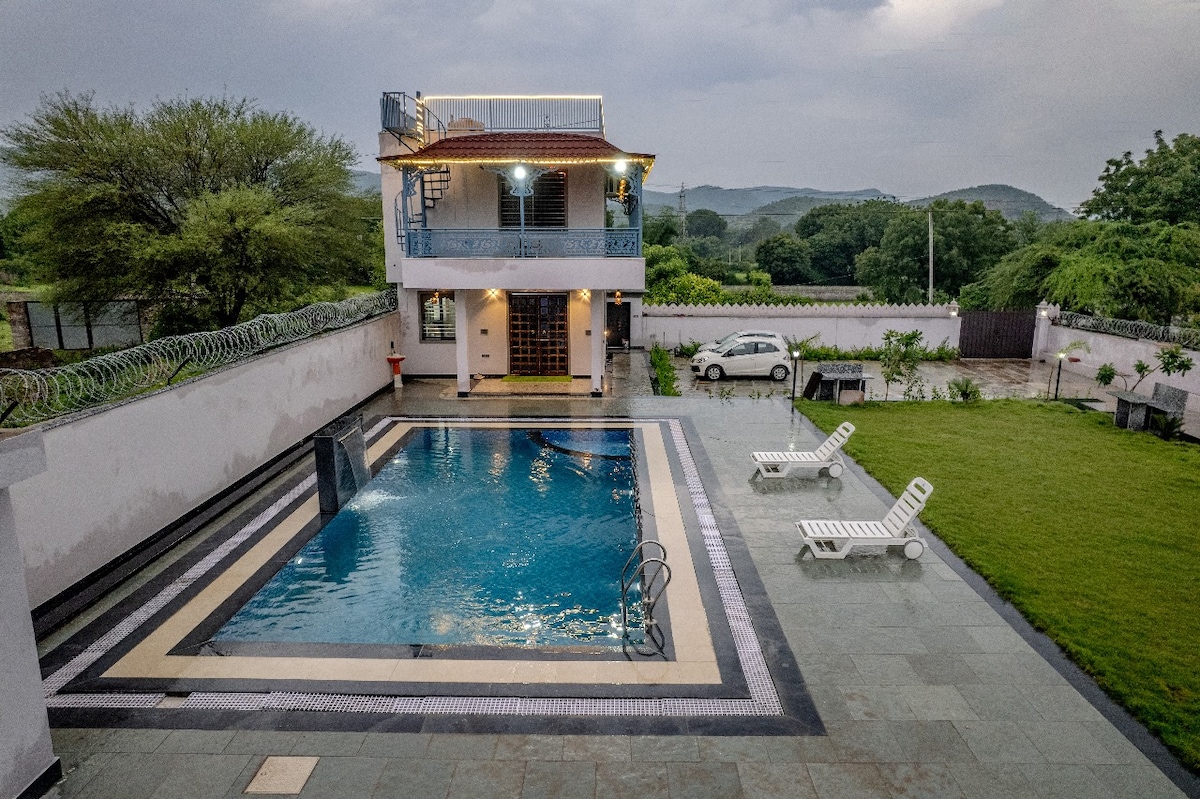 Welcome to our peaceful nature villa near Udaipur, surrounded by mountains and greenery. The property features one luxury room with direct pool access and two outdoor camping tents. Guests can enjoy beautiful pool views, stunning sunset views, fresh air, and the relaxing sound of birds in a calm village-style environment. Perfect for couples, nature lovers, solo travelers, and international guests looking for a peaceful and private stay close to nature.