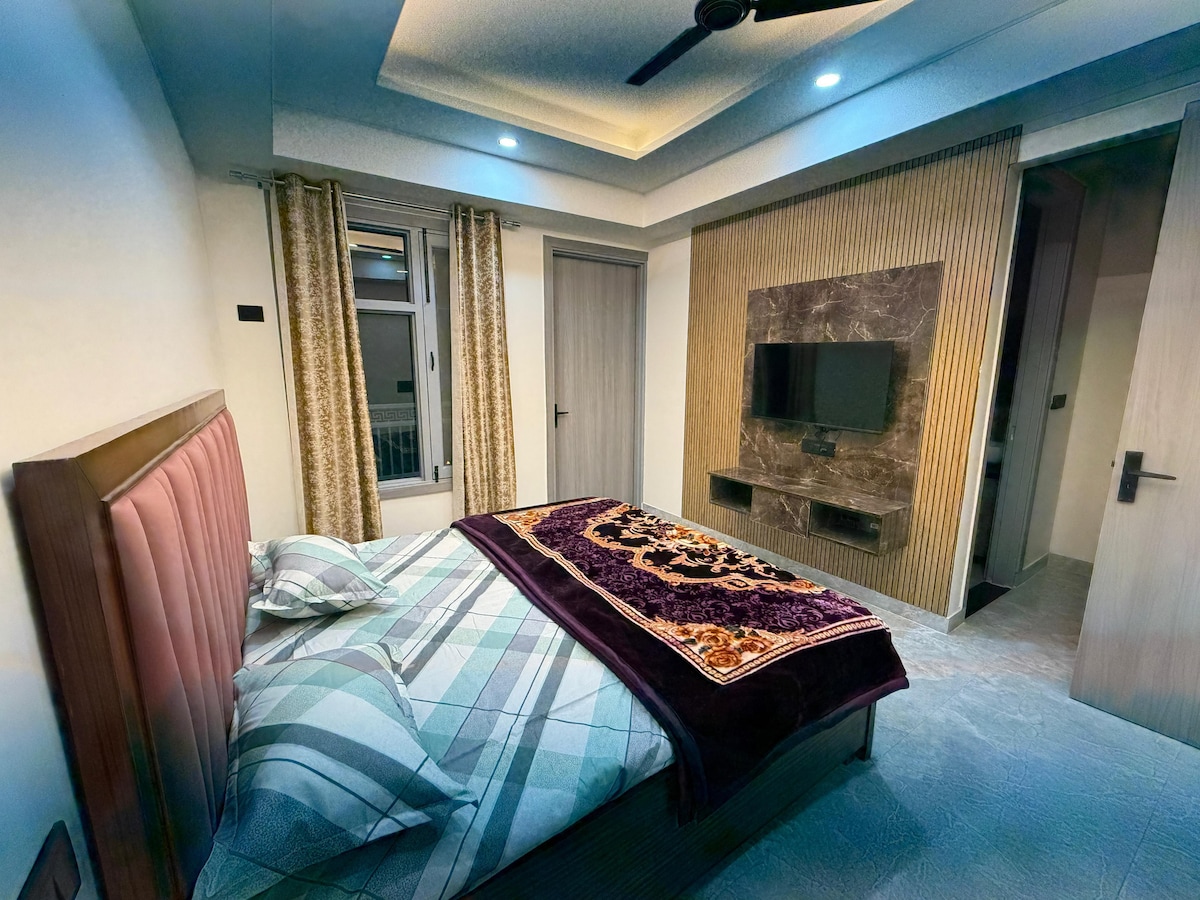 Luminoso e acolhedor 1BHK no Sector 56, Gurugram, a minutos do Rapid Metro 55-56. Perfeito para casais, viajantes individuais e estadias de curta duração. Desfrute de um quarto confortável, área de estar, Wi-Fi rápido, ar condicionado, smart TV e cozinha equipada. Caminhe até ao Mercado de Huda, cafés e Grand View High Street, ou faça uma curta viagem até ao Golf Course Rd e à vida noturna do Sector 29. HUDA Park tranquilo nas proximidades e check-in autónomo fácil. As noites esgotam-se rapidamente. Reserve agora para confirmação imediata!