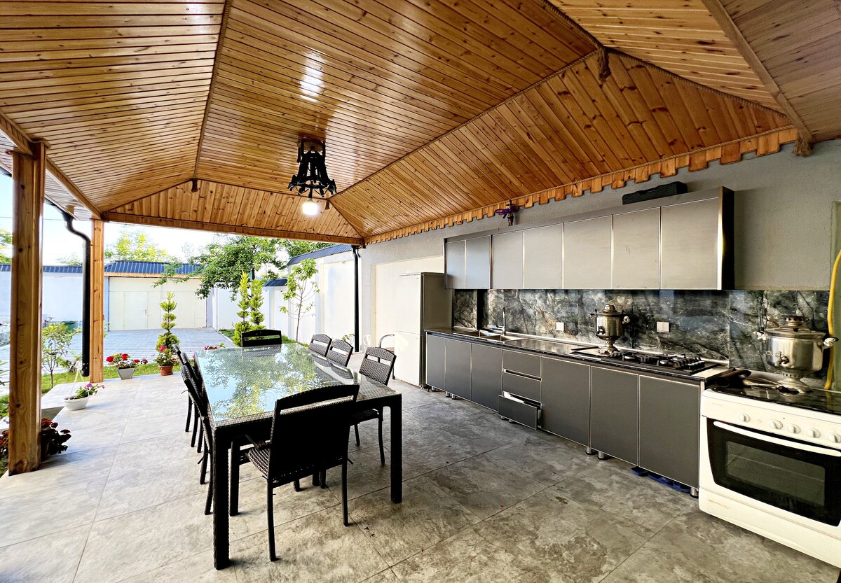 Um refúgio tranquilo no coração da natureza, com as vistas deslumbrantes da montanha de Gabala, mas convenientemente localizado perto do centro da cidade! Esta encantadora casa acomoda confortavelmente até 6 hóspedes e oferece total privacidade com uma entrada privativa e um espaçoso quintal. Desfrute do seu café da manhã ou jantar no ar fresco da montanha, graças à área de jantar ao ar livre. É a fuga perfeita do barulho da cidade, permitindo que você se reconecte com a natureza. Ideal para famílias e grupos de amigos