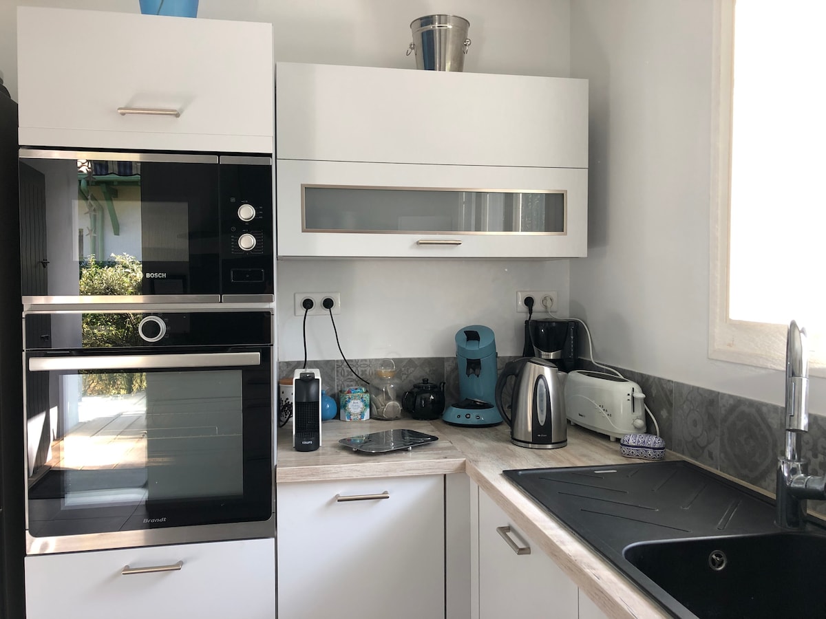 Moradia isolada renovada num terreno arborizado e fechado de 1311 m2. Piscina grande, 12mX6m, aquecida no verão e protegida por uma persiana elétrica. Piscina rodeada por um terraço de madeira virado a sul com espreguiçadeiras. 5 bicicletas à sua disposição gratuitamente. Cozinha independente, comodidades de luxo renovadas em 2019. Terraço exterior mobilado (toldo elétrico, churrasqueira) Praia, porto, lojas e estação ferroviária a uma curta distância a pé. Ambiente muito tranquilo e arborizado.