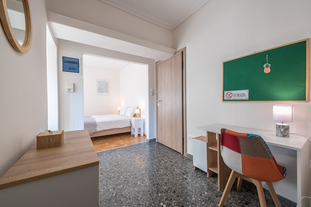 Bem-vindo ao estúdio de luxo acessível a uma curta caminhada do metrô Ambelokipi! Este aluguel limpo e moderno foi cuidadosamente projetado para maximizar o seu conforto em 30 metros quadrados de espaço com ar condicionado e aquecimento a gás natural. Os hóspedes vão adorar o colchão confortável, várias opções de iluminação dentro do apartamento, uma porta segura e vários itens embutidos, como o armário, geladeira e máquina de lavar. A cozinha está totalmente funcional e equipada.