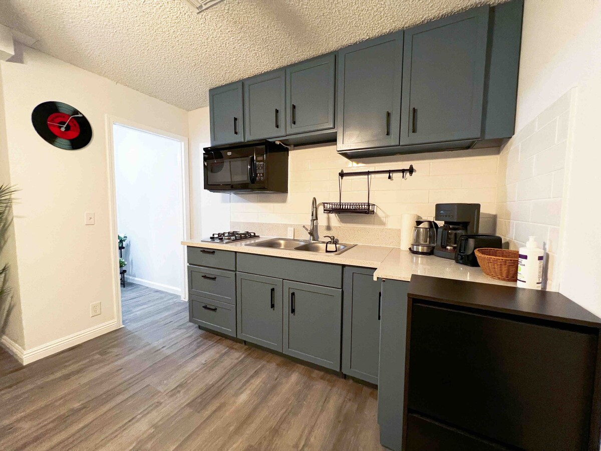 Nova construção 2 camas 1 banho joia escondida moderna! Esta Guesthouse tem um pátio privado, uma entrada e uma entrada. A pouco menos de 600 pés quadrados, nenhuma pedra foi deixada para trás ao projetar este espaço. Esta casa de conceito aberto possui uma sala de estar com um sofá-cama, TV Roku de 50", mesa de jantar de 4 cadeiras, um sistema de ar condicionado e aquecimento controlado remotamente. Cozinha completa com micro-ondas, forno, frigorífico e máquina de lavar/secar roupa. Casa de banho completa com banheira e duche. 2 quartos, 1 com cama queen e o outro w 2 camas individuais.