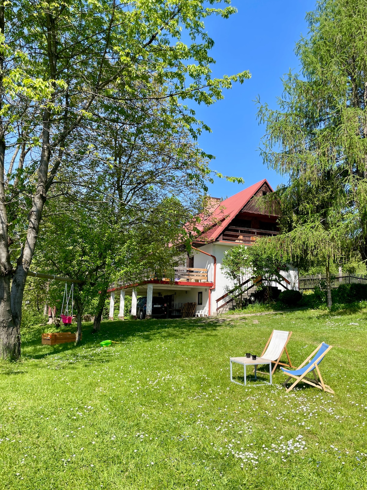 A casa está localizada numa zona tranquila de montanhas e rio. Ótima localização - trilhas de montanha e ciclovias, rio - praia, caiaques, etc. Muito confortável casa de dois níveis com enorme jardim e fogueira. Perto de elevadores de esqui no inverno.