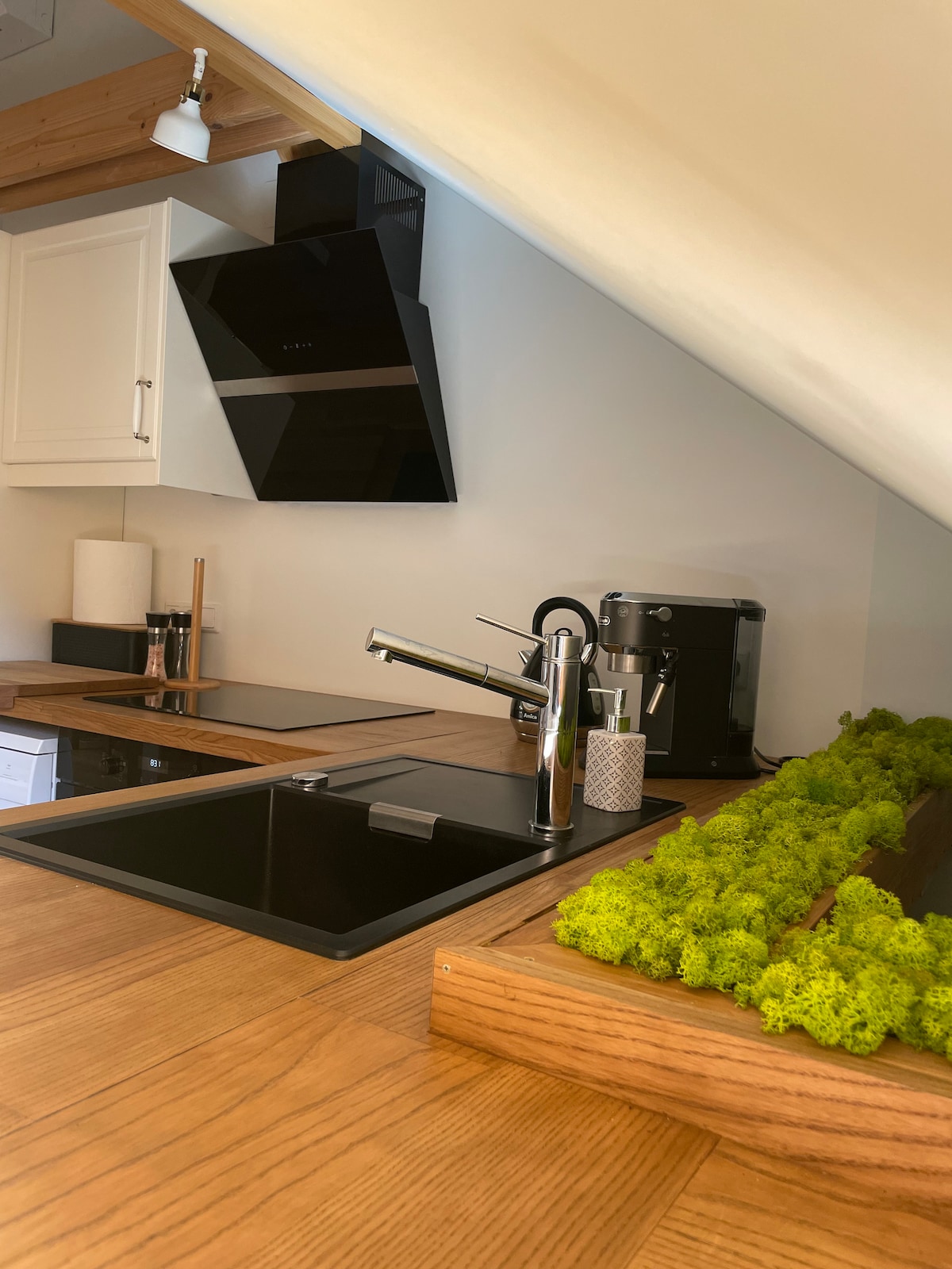 Bem-vindo ao Piecowy Zakątek! O fogão de azulejos é o ponto central do apartamento, é aqui que bate o seu "coração". Esta obra contemporânea do artista-escultor de Bieszczady, Robert Górka, combina as vantagens de um fogão de azulejos, ou seja, calor radiante e uma lareira - a capacidade de admirar o fogo. Proporcional, elegante, assentado sobre uma base de mármore, com uma porta de ferro fundido perfeitamente combinada, foi criado com base em azulejos vintage, e em seu interior há uma lareira de chamota construída com métodos de Zduń.
