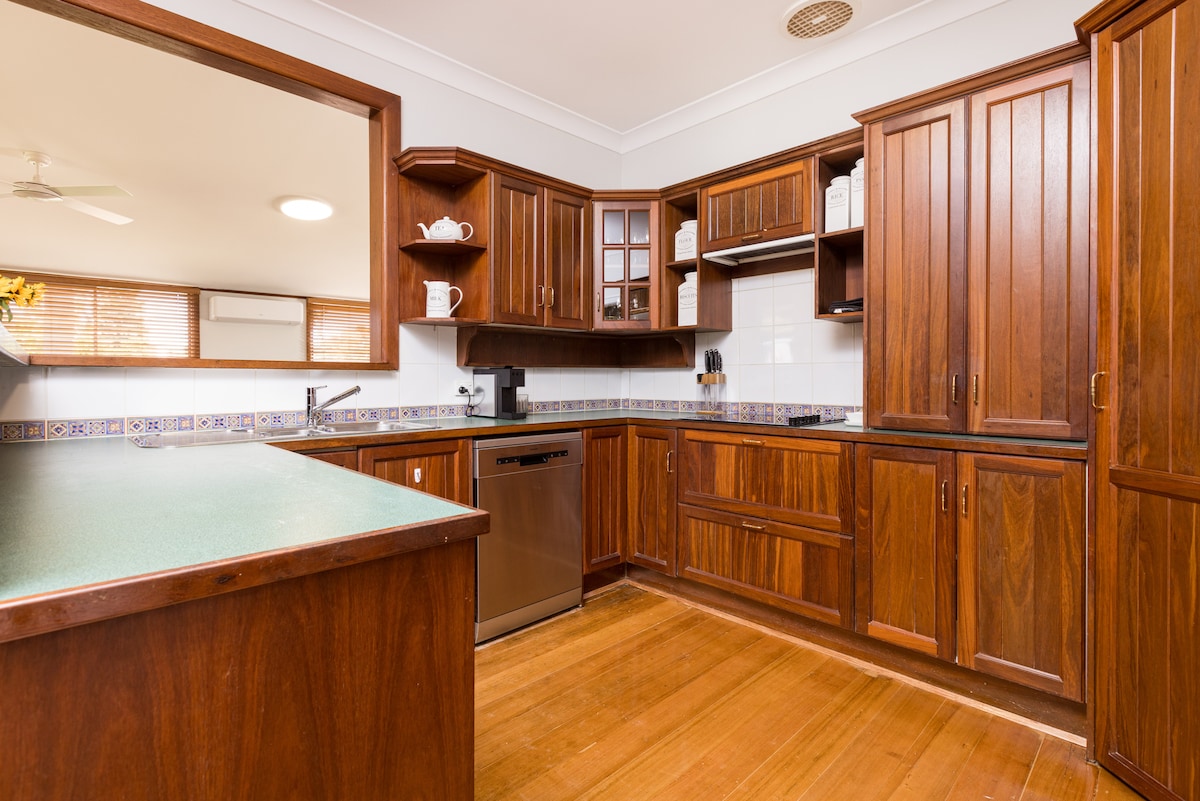 Elegante refúgio com 4 quartos, 3,5 banheiros, que aceita animais de estimação no coração de Mildura, com piscina cristalina, esteira e amplos espaços de entretenimento ao ar livre com churrasqueira.Esta casa histórica decorada com bom gosto dispõe de cozinha totalmente equipada, banheira de hidromassagem no quarto principal, Wi-Fi e espaços de trabalho em todos os quartos king-size.Com estacionamento seguro, este retiro no centro da cidade está perfeitamente localizado a uma curta distância da orla do rio, mercados, Centro de Artes, Trilha das Luzes, restaurantes, cafés e lojas.