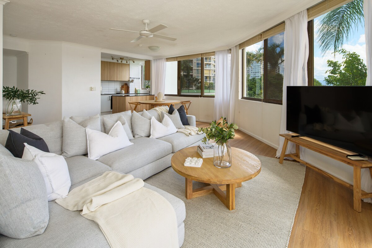 * Elegante e colorido, moderno, DESLUMBRANTE * Vistas deslumbrantes em "todas" as direções (ver fotos). Simplesmente DESLUMBRANTE * Deslumbrantes casas de banho NOVAS com tema oceânico * Wi-Fi rápido GRATUITO, Netflix e estacionamento * Praia: tão perto! * Clube de Surf, Ótimo Jantar! * Trilho costeiro para bicicletas, 4 bicicletas GRATUITAS para si, bicicletas elétricas para alugar. * Fácil acesso a elétricos e autocarros, restaurantes e cafés, parques temáticos, aventura ao ar livre * Piscina externa e spa, campo de ténis, área de churrasco recentemente renovada em 2025. * Ginásio interno, sauna, piscina aquecida e spa