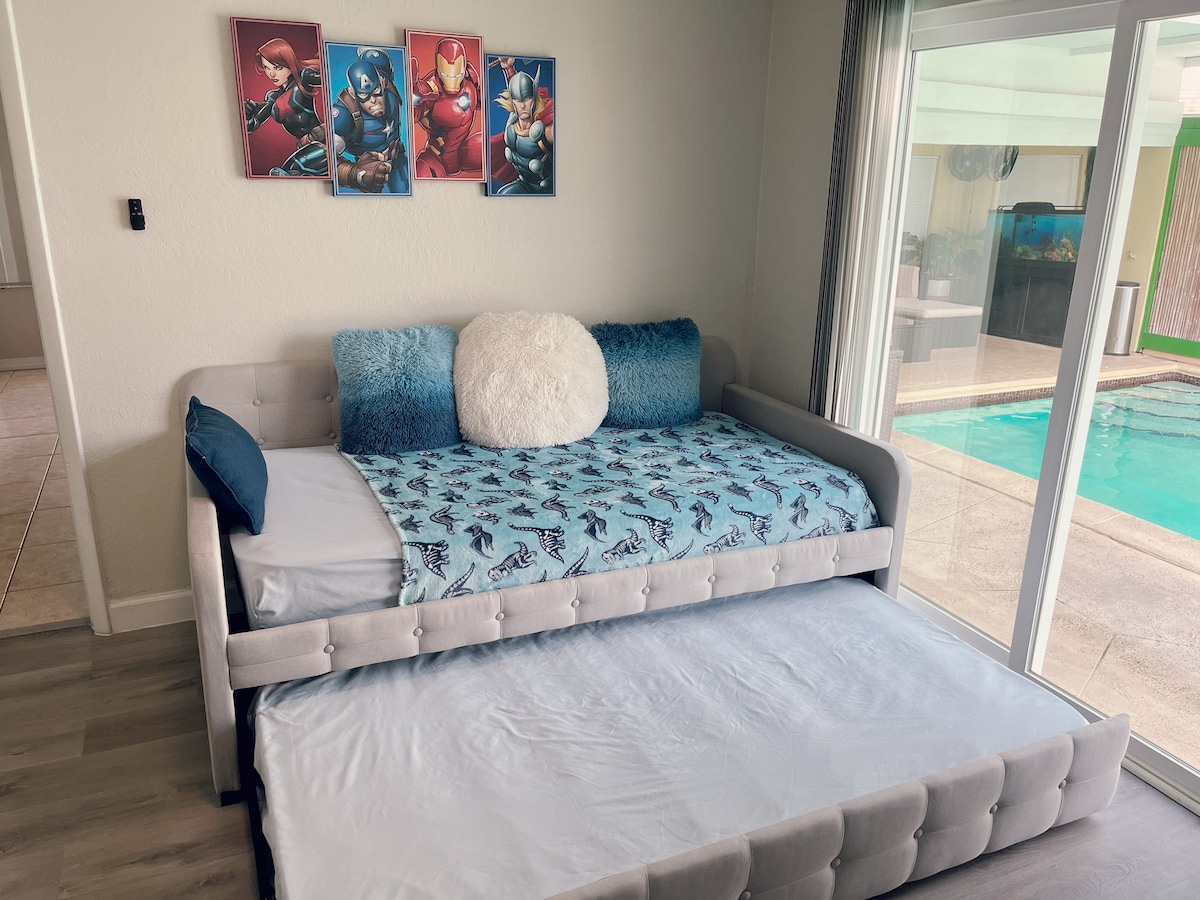 Bring the whole family to this great place with lots of room for fun. This location is 20 minutes from Miami or Ft. Lauderdale airport’s, or cruise ports. Safe gated community with ongoing security monitoring. Bedroom 1: king, Bedroom 2: Queen, Bedroom 3: two twins and one additional foldable twin bed that can go anywhere in the house including the bedrooms, den, living room…. The house is very spacious.
