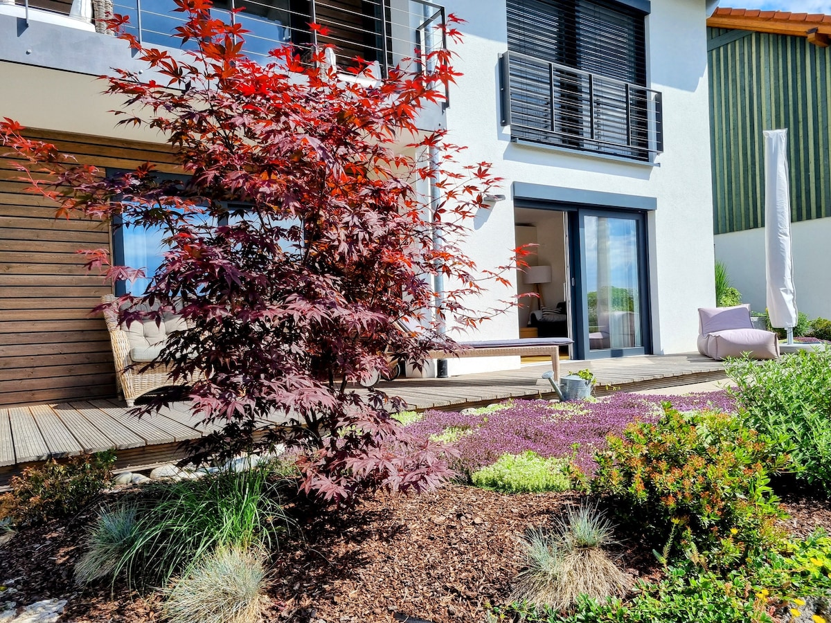 O apartamento está localizado no lado sul da nossa casa e tem uma entrada separada. 57 metros quadrados de espaço habitável esperam por você, com banheiro com chuveiro incl. Máquina de lavar e cozinha totalmente equipada. Aquecimento por piso radiante em todo o apartamento. A espaçosa sala de estar - quarto com uma cama de casal aconchegante também oferece espaço suficiente para dois hóspedes. O terraço convida a relaxar nos dias de sol.