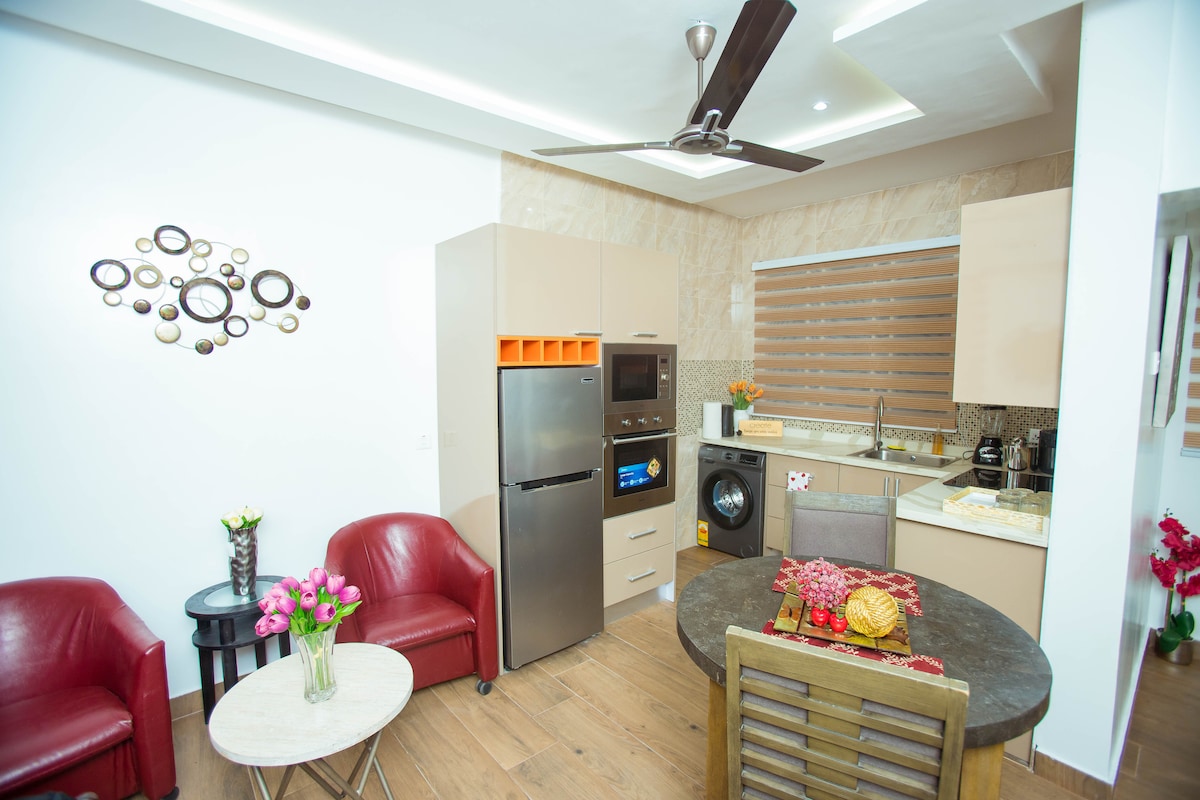Curta uma experiência elegante e confortável neste lugar bem-localizado. Este apartamento estúdio recém-aninhado localizado no coração de Acra, que fica a 5 minutos de carro do aeroporto. Este apartamento oferece uma vibração residencial tranquila, juntamente com um acesso rápido e fácil às áreas do centro da cidade. Admire a decoração nítida e contemporânea do espaço de estar em plano aberto.