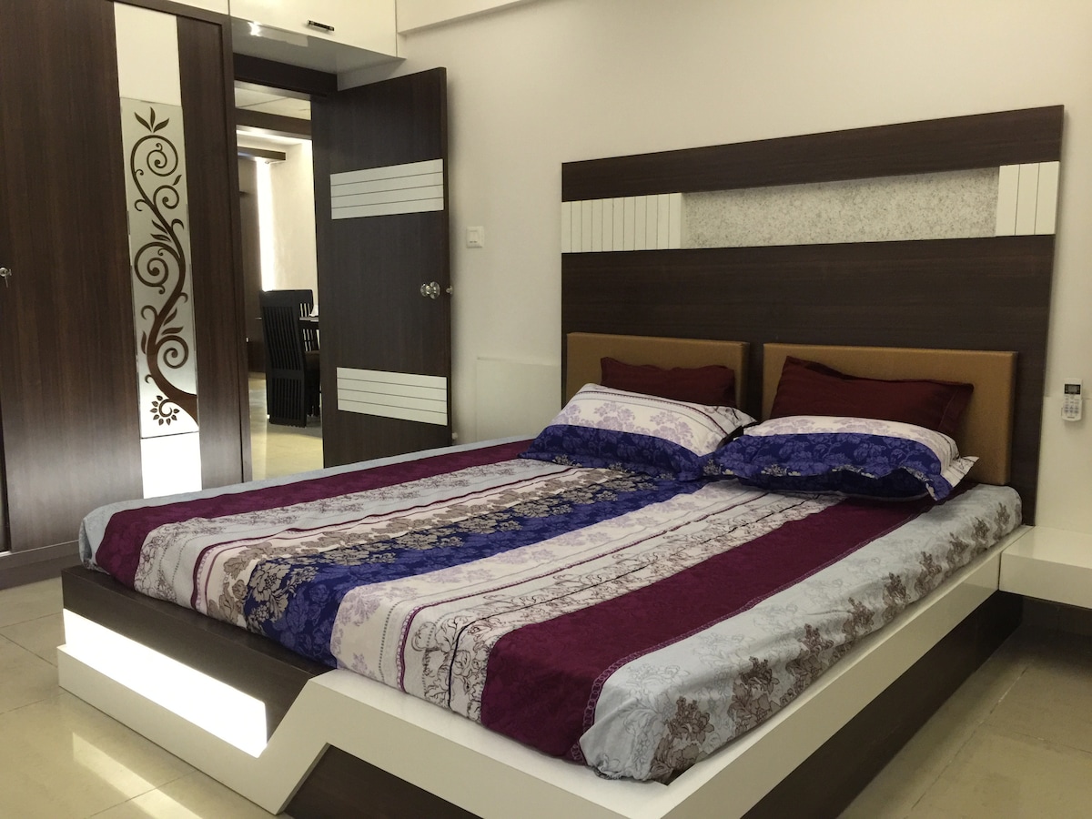 Apartamento espaçoso e bem mobilado com quartos AC com cómoda/armário, cama king size com casa de banho anexa. Bela varanda arejada e agradável com vista para o jardim, acesso Wi-Fi gratuito, parece a sua própria casa. Apartamento sem mosquitos e sem pó. Este lugar é ótimo para famílias NRI. Tranquilo, confortável e seguro. Cozinha com todos os eletrodomésticos e utensílios. Mercearia e mercado de vegetais a uma curta distância a pé. Tarifas mensais e semanais. Horário de check-in flexível.