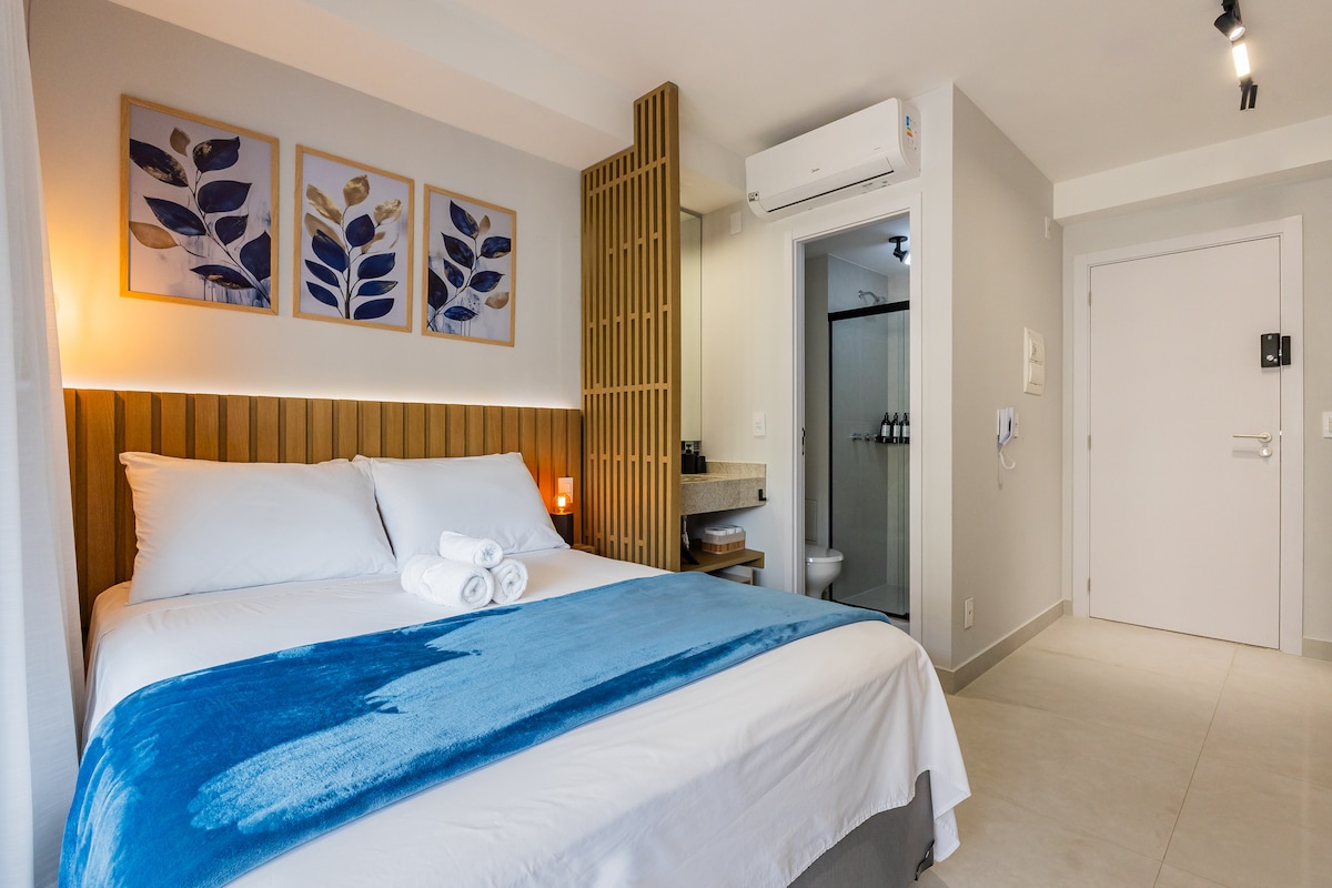 Estúdio moderno e ensolarado com cama queen size