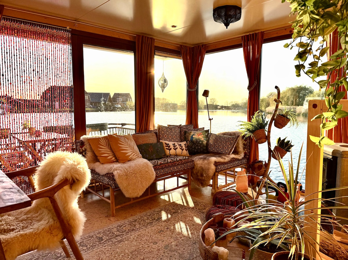 ✨ Mini retiro em Happy on the Vecht ✨ Uma minicasa flutuante única, mesmo no Vecht, para desfrutar de paz e aventura. Comece o dia na água e reme rio acima nas nossas pranchas de paddle, dê um mergulho refrescante e, em seguida, aqueça-se na sua sauna privada ou sob o chuveiro aquecido da selva. Desfrute de paz, natureza e pores do sol espetaculares. No interior, esperam por si luxuosas toalhas de sauna, roupões de banho e roupa de cama Optidee. Desperte ao som dos patos e com vista para a água. Compacto, romântico e perfeito para recarregar energias.