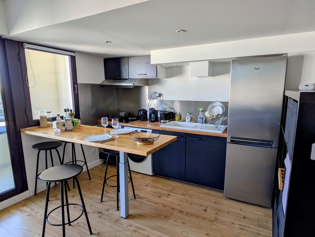 Grande T2, (perto de Stade Chaban Delmas, Fac de Médecine, Chu, com sala de jantar (30 m2), 1 quarto com cama de casal, sofá-cama confortável na sala de estar, casa de banho com chuveiro (grande), WC separado, cozinha separada com frigorífico e congelador, forno multifuncional, placa de indução, exposição leste-oeste, com terraço e varandas, estacionamento seguro, perto de todas as comodidades: elétrico a 10 minutos a pé, autocarro a 2 minutos a pé, ar condicionado, pequeno-almoço incluído.
