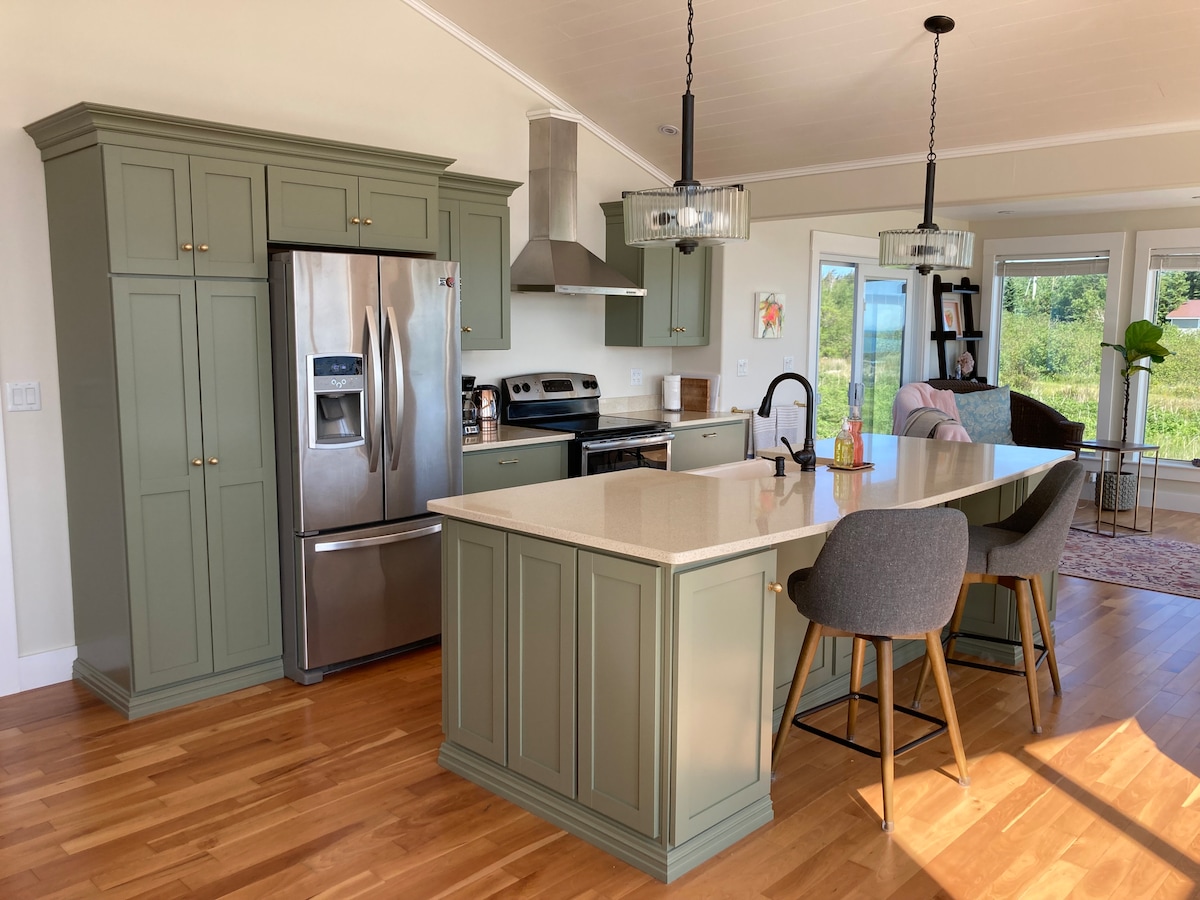 Beach Glass Cottage: um retiro litorâneo com ar de spa Inspirado nas praias de Grand Manan, o Beach Glass Cottage tem um charme único, com areia, névoa e vidro. Construído no verão de 2022, este chalé de conceito aberto apresenta uma cozinha totalmente equipada, dois quartos e um banheiro de luxo. Atravesse as portas da varanda para um pátio privado com um sofá modular, mesa de jantar, churrasqueira e vistas deslumbrantes para o mar. Ideal para famílias e animais de estimação, esta casa de campo oferece comodidades atenciosas para uma estadia relaxante.