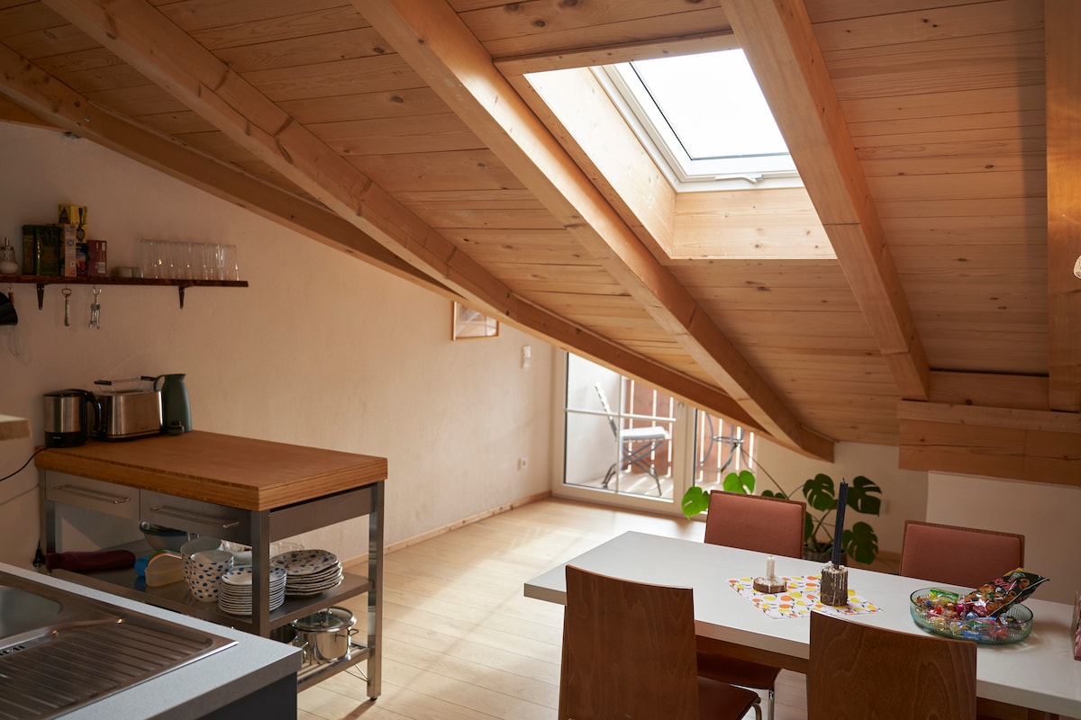 Nosso apartamento no sótão com duas varandas lhe dá a oportunidade de olhar para as montanhas ou para o pôr do sol. O telhado inclinado dá ao apartamento um charme rústico, mas ainda assim cuidado com a cabeça ;) Como o apartamento está no último andar, é necessário subir escadas por 3 andares.