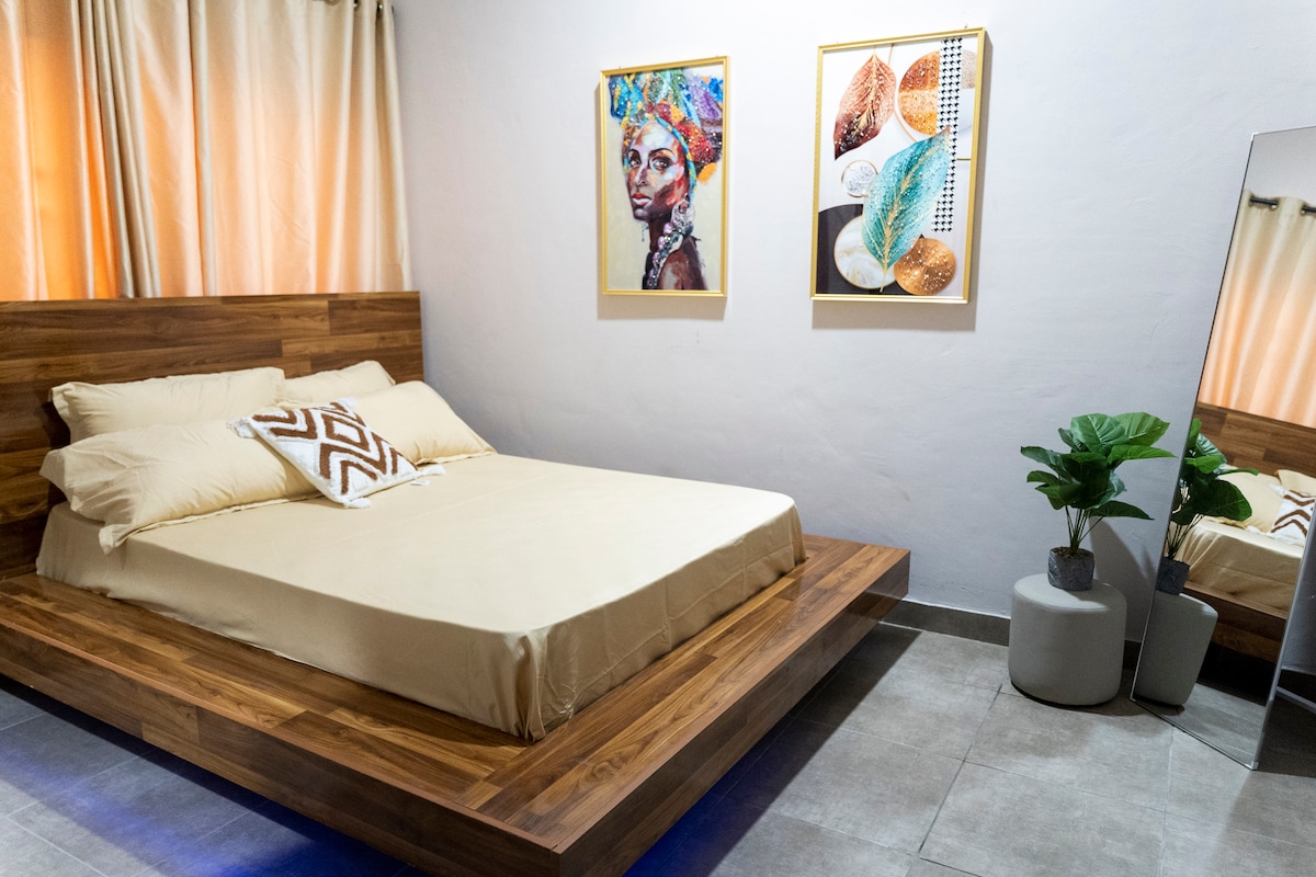 Desfrute de uma estadia tranquila nesta casa de 2 quartos lindamente concebida, rodeada por jardins verdes exuberantes e vistas deslumbrantes para a Montanha Aburi. Localizado numa área segura com segurança 24/7, dispõe de uma cozinha totalmente abastecida, internet de alta velocidade, uma piscina refrescante e um parque infantil. A propriedade fica nas proximidades da Montanha Aburi e de trilhos para caminhadas, ideais para os amantes da natureza. A apenas 45 minutos do Aeroporto Internacional de Kotoka, fica a poucos passos de um centro comercial com comodidades básicas.