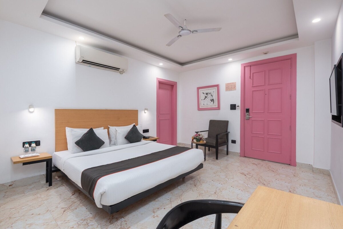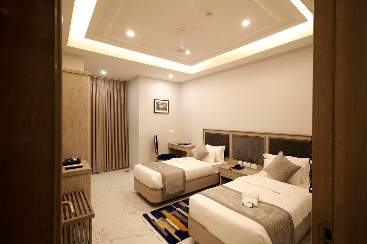 Modern Hotel Room with Premium Comfort Relax in our stylish hotel room featuring a comfortable queen-size bed, private bathroom, flat-screen TV, and complimentary Wi-Fi. Guests enjoy - Nice City View from the window. Housekeeping ( ON - Call ) Access to hotel amenities including the In-house restaurant. RO water Induction for light cooking. Kattle Fresh Towels Fresh Hand towels. Mini Fridge. Kitchen utensils.