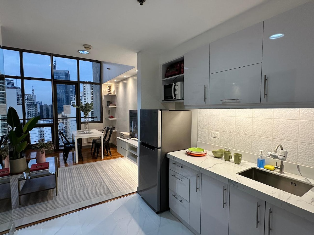 Designer recém-decorado de luxo 1BD com varanda, no coração da bela Makati ao lado de shoppings verdes, curta caminhada para tudo, muitos restaurantes, cafés, bares, supermercados, parques, caixa eletrônico, farmácia, padarias, SPA, bar de esportes, colchão mais confortável, nova TV grande com 16000 canais IPTV, aplicativos de filmes, lavadora/secadora, dispensador de água quente/fria, quartos bem climatizados, cozinha completa, internet de fibra óptica, chave de código digital apenas para você expira no check-out, A torre também tem uma grande piscina e academia.