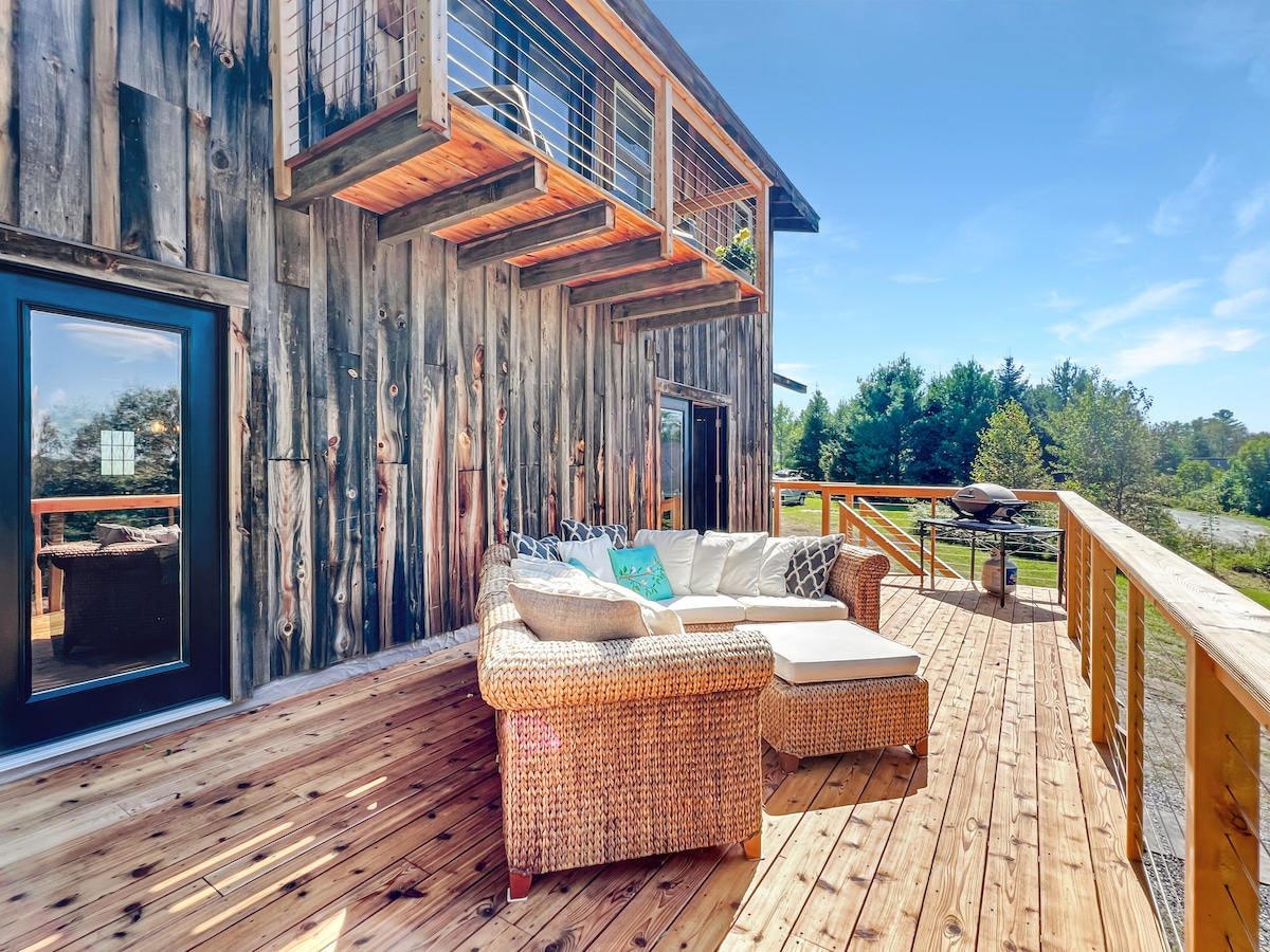 Esta cabana está aninhada numa propriedade privada de vários hectares, com características únicas, incluindo uma praia de seixos para nadar e um grande deck para relaxar e ouvir a chamada dos lunáticos. Vai sentir-se longe de tudo, a poucos passos do centro da cidade. O duplex tem um lado vermelho e verde idêntico, cada um com 2 quartos, cozinha, casa de banho completa com chuveiro e sala de estar com futon. As duas unidades estão ligadas através de uma porta no alpendre coberto com acesso exterior a cada unidade de ambos os lados do convés.