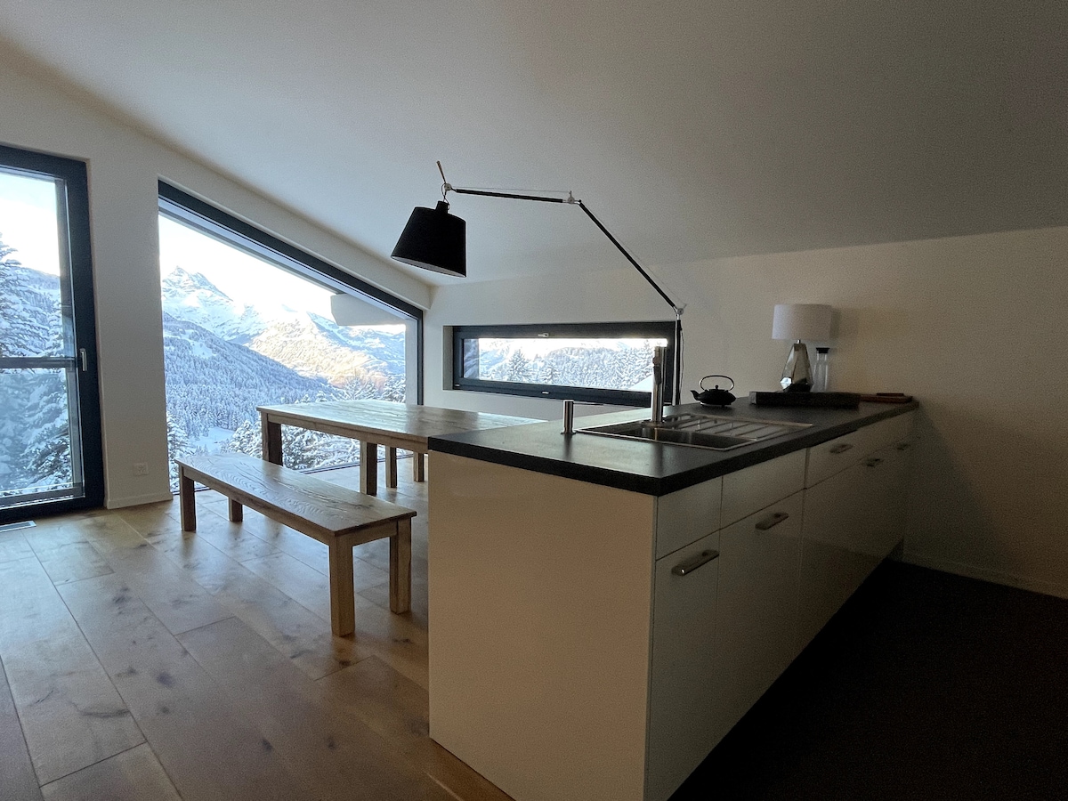 A nossa casa de férias é um apartamento de sótão de 70 m2, iluminado e espaçoso, nos Alpes suíços, ideal para esquiar (pista ao lado da casa), andar de bicicleta e fazer caminhadas. Perfeitamente adequado para uma família ou para um grupo de 4. Pode acomodar até seis (com quatro a partilhar um quarto). A varanda virada a sudoeste é ideal para aperitivos ou churrascos ao final da tarde. Totalmente equipado para pessoas que adoram cozinhar. Facilmente acessível por transportes públicos e carro e lojas, restaurantes, pistas de esqui e trilhos para caminhadas ficam a poucos metros de metros.