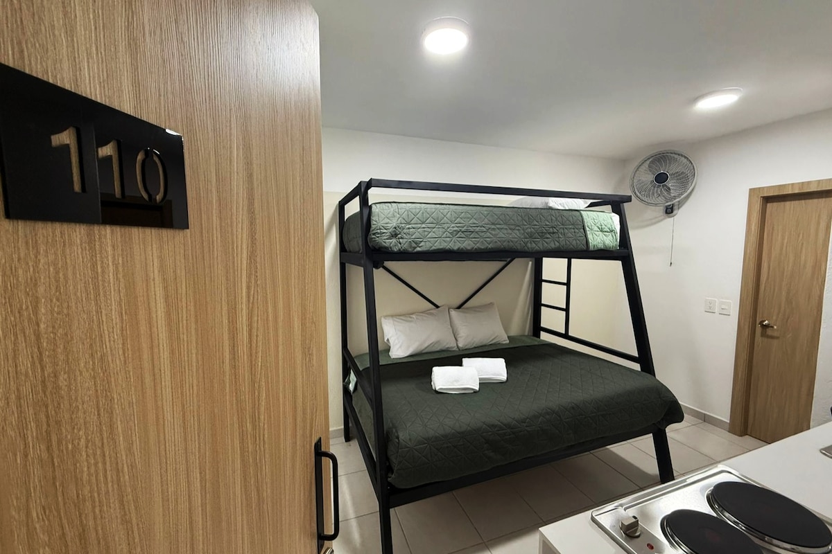 Este estúdio tem uma área de cozinha, área de jantar e área de dormir, tudo em um grande quarto, bem como um banheiro separado. Localizado no bairro de La Calma, que é seguro e familiar com farmácias, lojas de conveniência, vendas de pizza, confeitarias, etc. A apenas 4 quarteirões de distância fica o novo shopping La Perla, com lojas e restaurantes de marcas internacionais. O parque do bairro fica a 5 quarteirões de distância. O Expo Guadalajara e o shopping Plaza del Sol ficam a apenas 5 minutos de carro. Lavanderia nas proximidades.