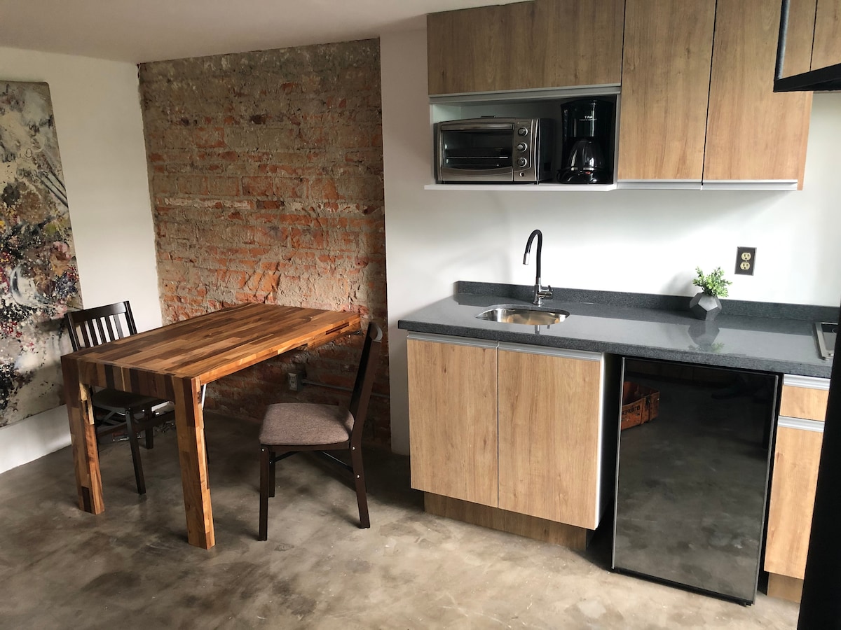 Estúdio privado com banheiro, cozinha, tela, cama king size, pequeno terraço e estacionamento para um carro, a uma quadra da Av. Chapultepec, onde você pode encontrar restaurantes, bares, área pública de lazer, lojas de todos os tipos, perto do centro histórico de Guadalajara e a poucos quarteirões do consulado americano, também tem transporte público à mão. Tudo isso tornará a sua estadia uma experiência confortável, prática e agradável.