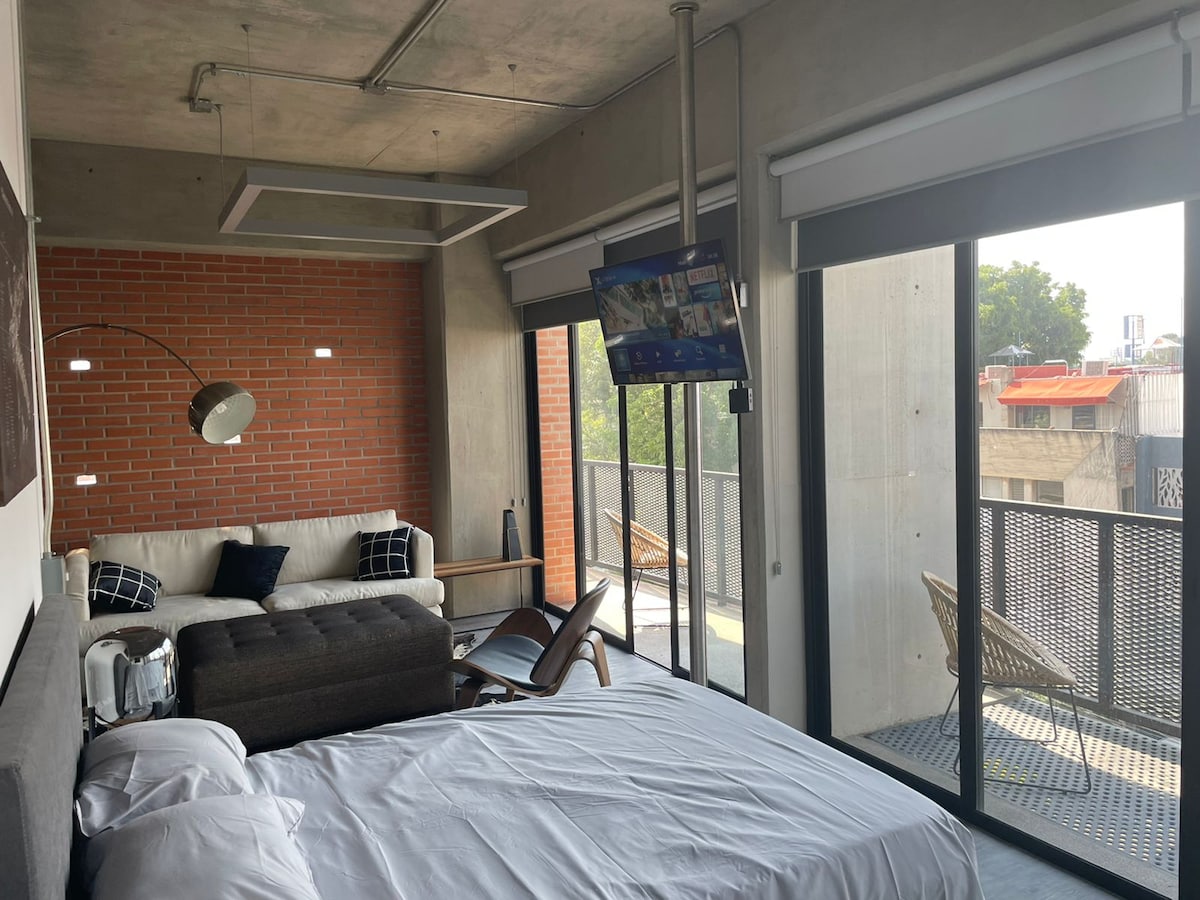 Jogue futebol e inspire-se com a arte que preenche as paredes deste loft de estilo contemporâneo. O concreto coloca o selo neste apartamento e combina perfeitamente com azulejos e móveis. É confortável e ideal para passear pela cidade a pé. Tem um terraço de onde se pode apreciar uma vista maravilhosa da região. O prédio tem câmeras de vigilância e segurança na entrada, você pode ficar tranquilo ao sair para conhecer
