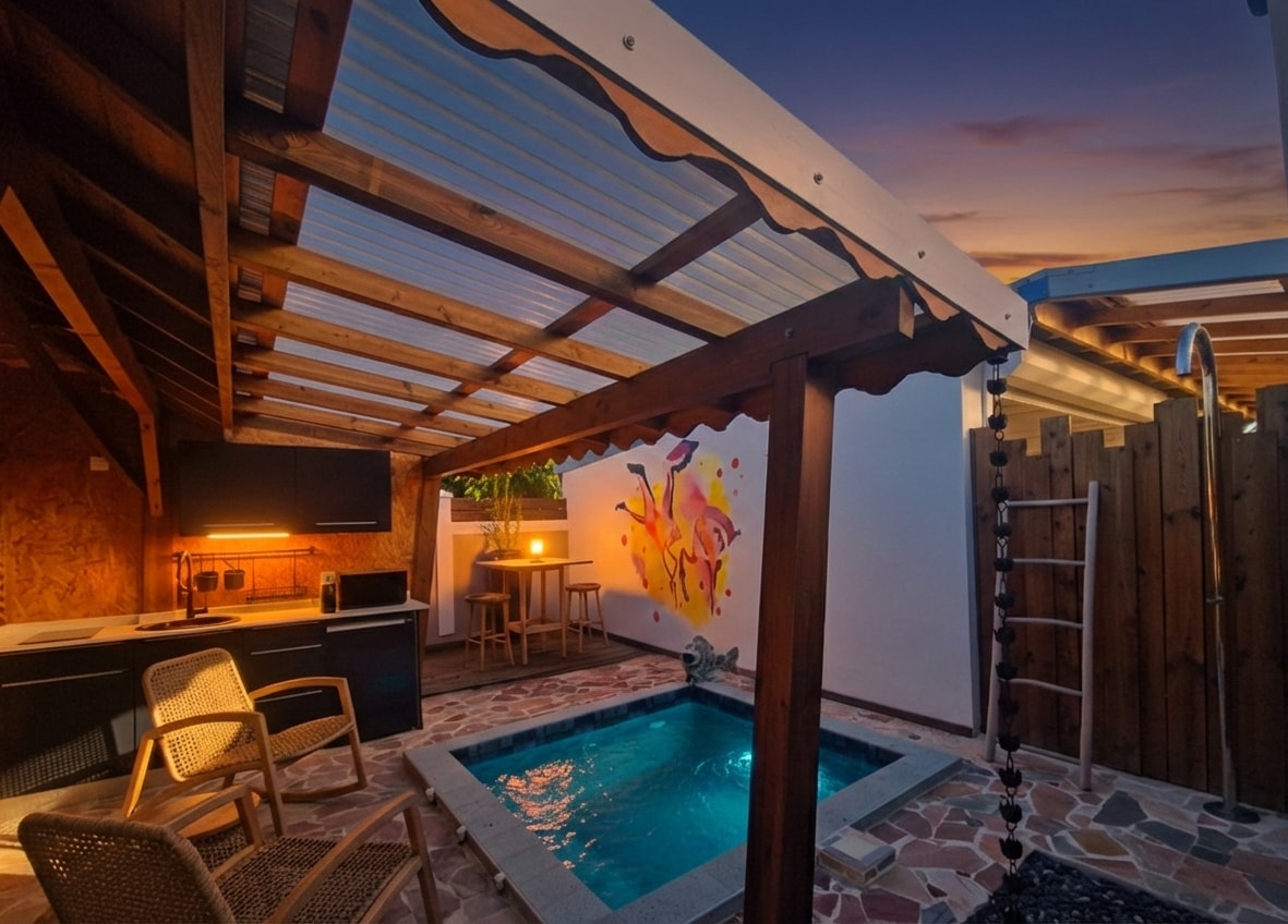 Suite Signature à Kawan Bay Suites Évadez-vous à Kawan Bay Suites**** à Deshaies. Cette résidence intimiste, inaugurée en 2021, offre 12 suites spacieuses avec jardin privatif et mini lagon. Profitez d’un havre de luxe et de tranquillité avec piscine de 27 mètre, bain à remous, beds, paillotes et restaurant. Chaque matin, savourez un petit-déjeuner américain à volonté (service non inclus dans la réservation) et bénéficiez de notre room service pour un séjour d’exception.