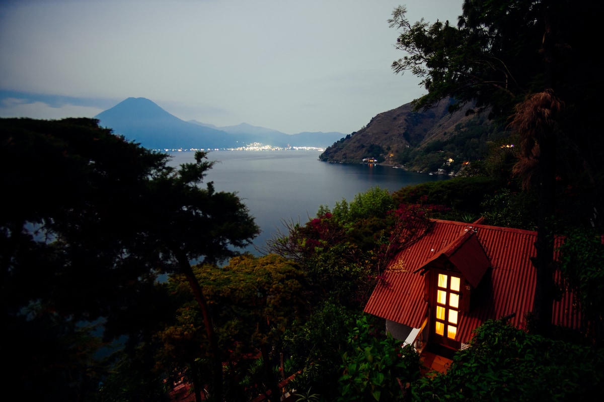 A Casa do Mundo SÓ é acessível por barco. CARACTERÍSTICAS ESPECIAIS: Acessível APENAS por barco Suíte espaçosa e confortável com uma lareira aconchegante. Varanda privada com vista para o lago. Rede para relaxar ou ler. Bela vista para o lago, vulcões e aldeias circundantes. Acesso gratuito à Internet sem fios. LOCALIZAÇÃO, CAMAS E CAPACIDADE: Localizado 2 minutos (85 escadas) acima do escritório e da área de jantar. 1 Queen e 1 Extra Solteiro Opcional. Acomoda até 3 pessoas. Casa de banho privativa.