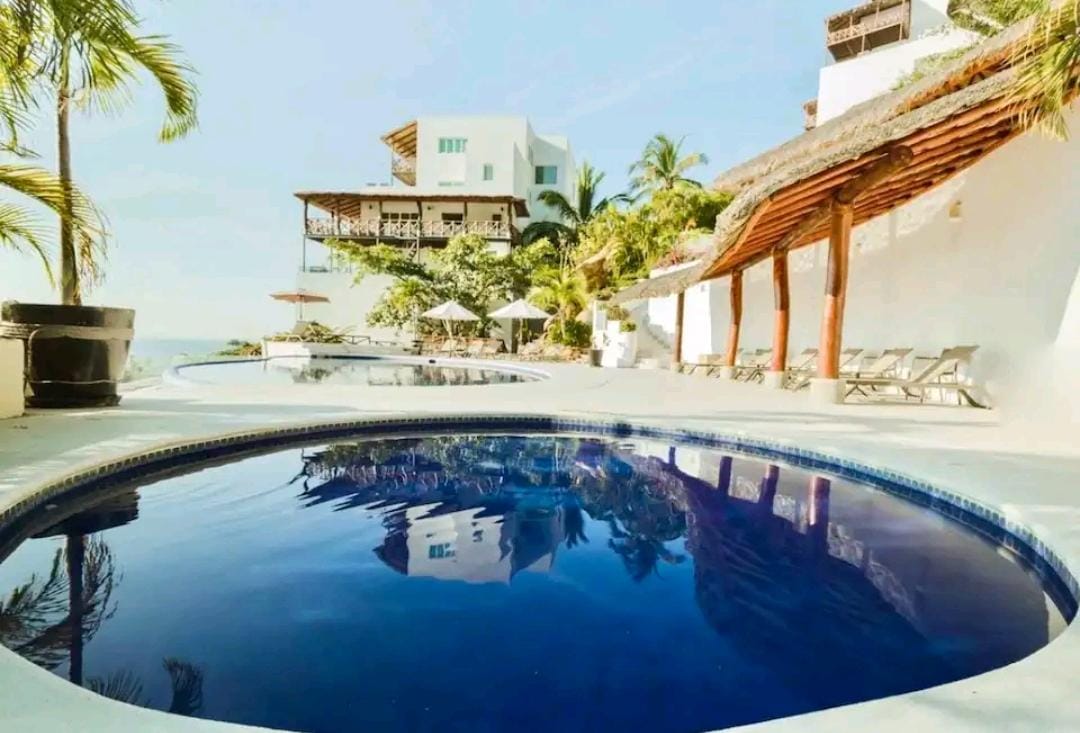 Linda e espaçosa casa privada com dois quartos na casa, mais três belas cabanas, para acomodar confortavelmente 20 a 25 pessoas confortavelmente, piscina, jacuzzi, a 5 minutos do aeroporto e a 20 minutos de Zihuatanejo, muito perto da área de restaurantes e hotéis de Playa Blanca, a poucos passos em frente à praia,