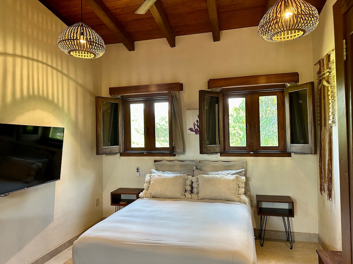 Esta bela suíte 1BR a poucos passos do surf de classe mundial em Playa La Saladita é um oásis com; - Cozinha totalmente equipada com utensílios de cozinha - Cama queen size com classificação de hotel e spa com cobertura de almofada. - Sussurre ar condicionado silencioso e ventoinhas de teto - Teto abobadado com belas vigas de madeira expostas - Portas francesas que se abrem para o terraço privado - Chuveiro tropical com água quente - Internet de alta velocidade Starlink - Smart TV de 50" - Mobiliário mexicano artesanal e decoração de inspiração marroquina