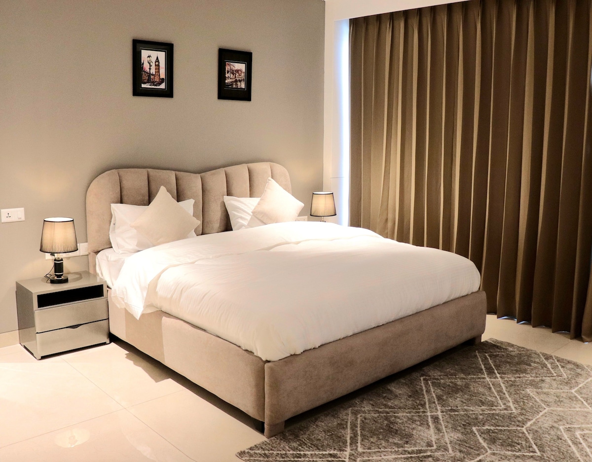 Bem-vindo à nossa incrível suíte que está situada no 15º andar de um edifício alto. Este 2bhk é um apartamento completamente novo. Amplo pátio privativo com vista para o horizonte da cidade torna-o único na classe. O lugar é perfeito para relaxar e desfrutar de vista panorâmica da arquitetura moderna. O apartamento está equipado com 3 TVs inteligentes (todos os aplicativos funcionam), 2 camas de casal aconchegantes, 2 guarda-roupas grandes com armário, sofá de 6 lugares, mesa de café elegante, tábua de passar, geladeira, micro-ondas, indução, chaleira elétrica, torradeira e muito mais
