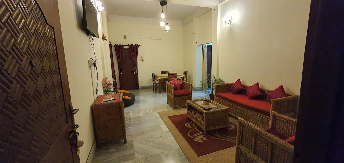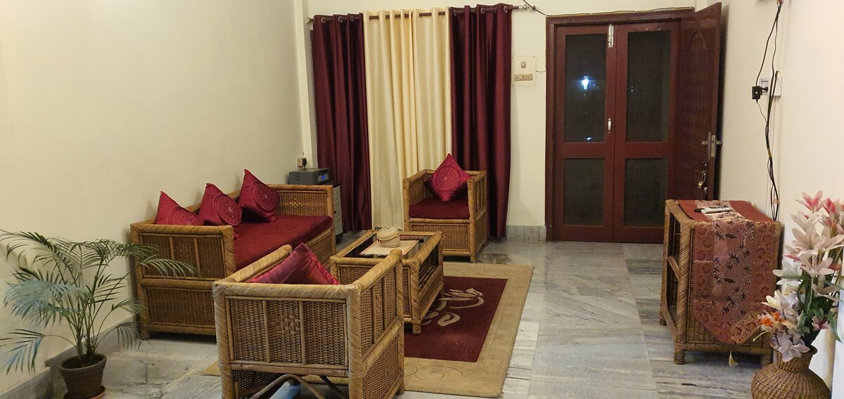 Casa de família com localização central em um bairro residencial. Localização conveniente e a uma curta distância dos hospitais Nemcare, GMCH e Apollo; Multiplex PVR; Starbucks, Pizza Hut, cafés populares, restaurantes requintados e shoppings. Cozinha e estacionamento disponíveis, adequados para estadias de longa duração para famílias e pacientes médicos. Wi-fi ilimitado e Smart TV para entretenimento e WFH. Anfitrião disponível o tempo todo para receber ajuda.