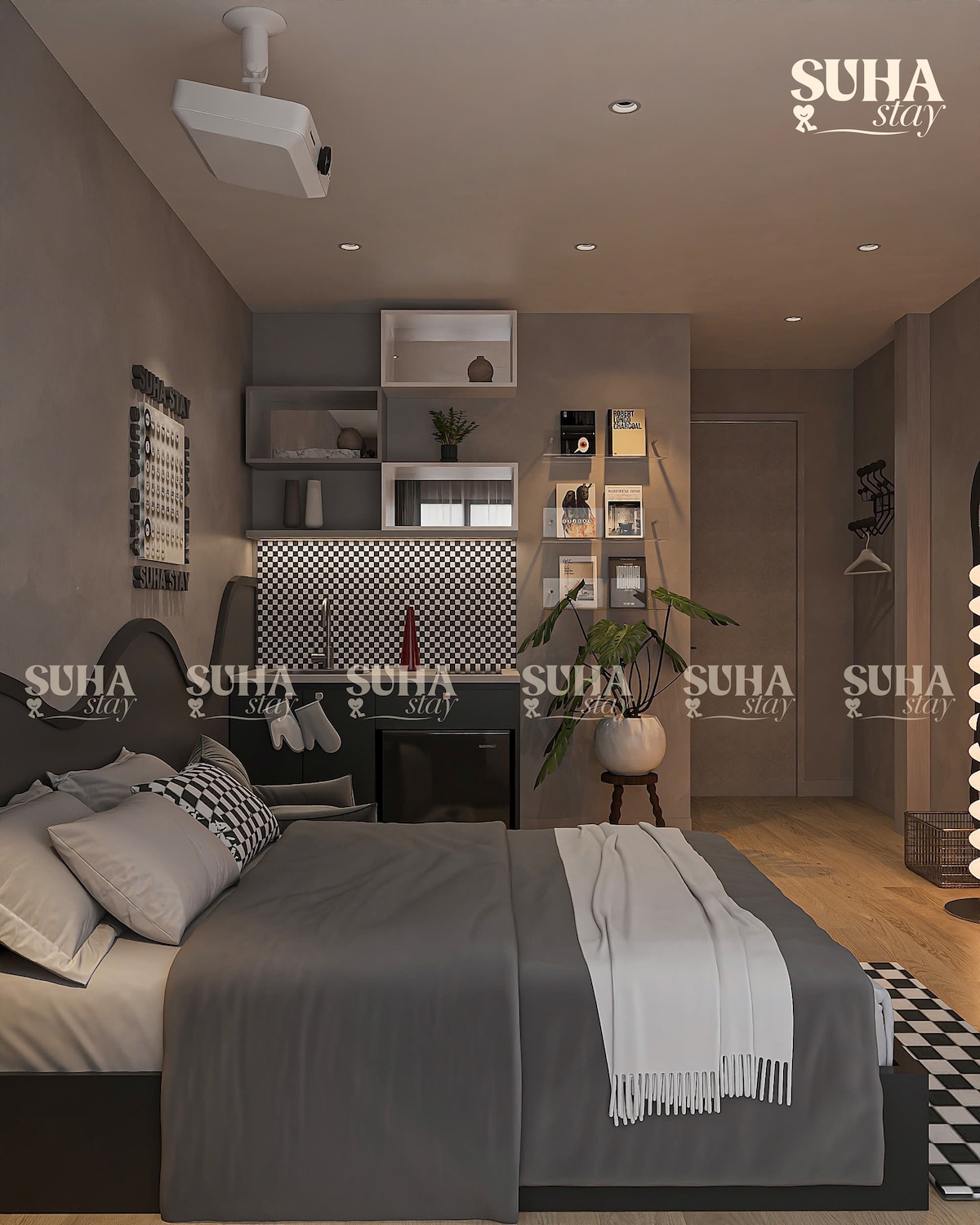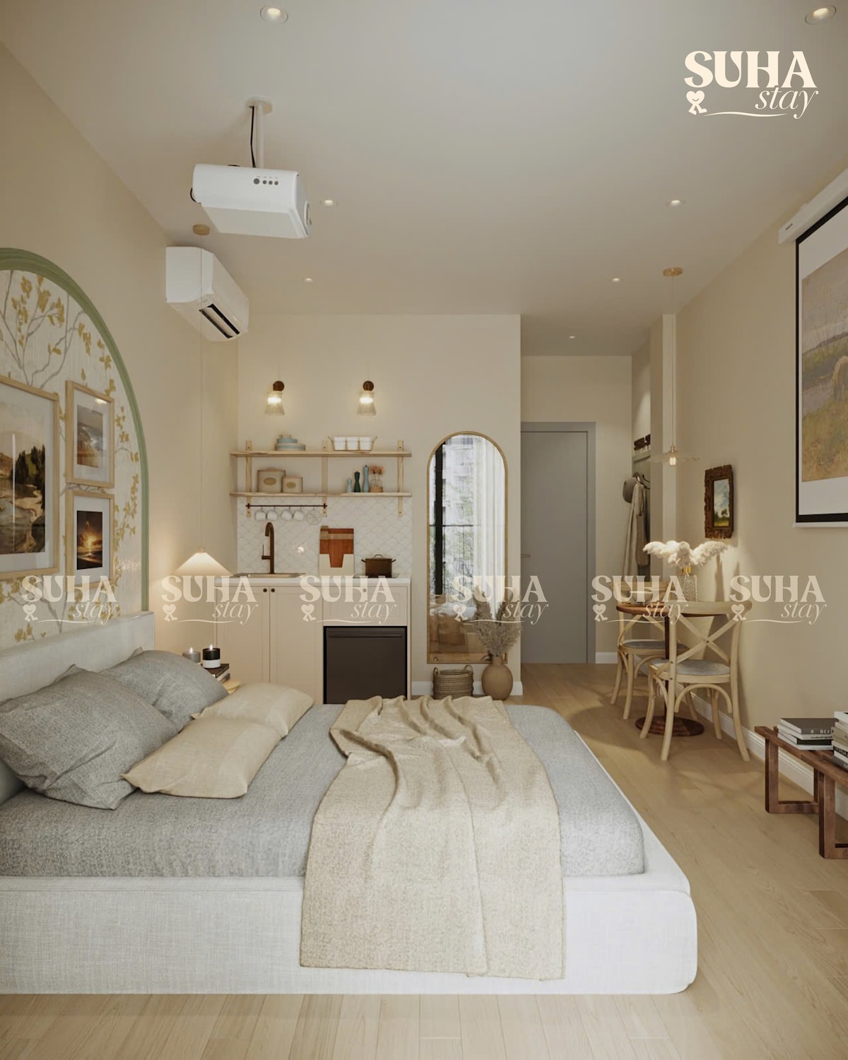 Colombus is an open lay-out studio apartment filled with sunlight through arched windows. The designed is inspired with the Mediterranean Genoa where Christopher Colombus was supposedly born and grew up.