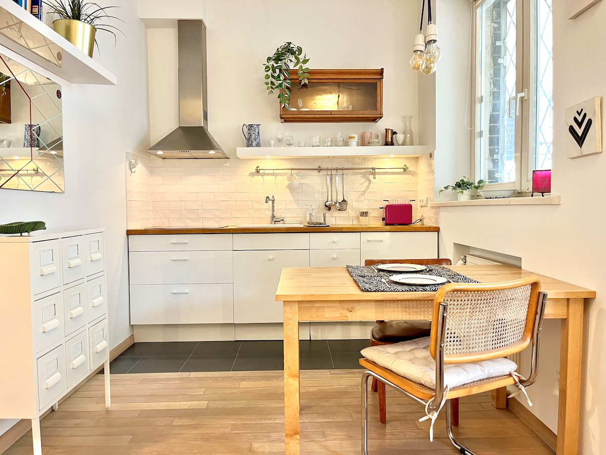 Um apartamento moderno e elegante, com 42 m², localizado num edifício do século XIX maravilhosamente restaurado. Combina o encanto da arquitetura histórica com mobiliário de alta qualidade, criando um espaço confortável e elegante. Localizado no 3.º andar com acesso por elevador. Os hóspedes têm acesso a um quarto separado, a uma sala de estar luminosa e espaçosa e a uma cozinha em plano aberto com uma zona de refeições – perfeitos tanto para escapadelas curtas na cidade como para estadias mais longas. O apartamento também inclui uma casa de banho com sanita. Check-in autónomo.