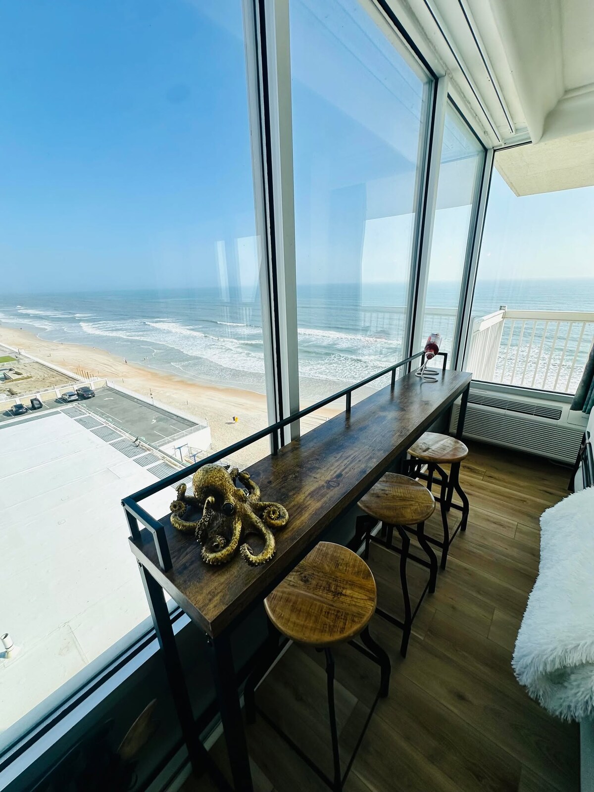 Wake up to breathtaking panoramic views of the Atlantic Ocean in this beautiful 9th-floor condo. Perfectly located for a relaxing beach getaway, this unit offers comfort, style, and unforgettable scenery from sunrise to sunset. ‼️Our pools and amenities are OPEN—1 outdoor & 1 indoor pools, sauna, gym! Due to the recent hurricane,2 others pools remain closed, the Tiki bar and hotel restaurant are unavailable.There is also visible damage to the seawall. The beautiful beach and ocean areOPEN! 🏖️☀️