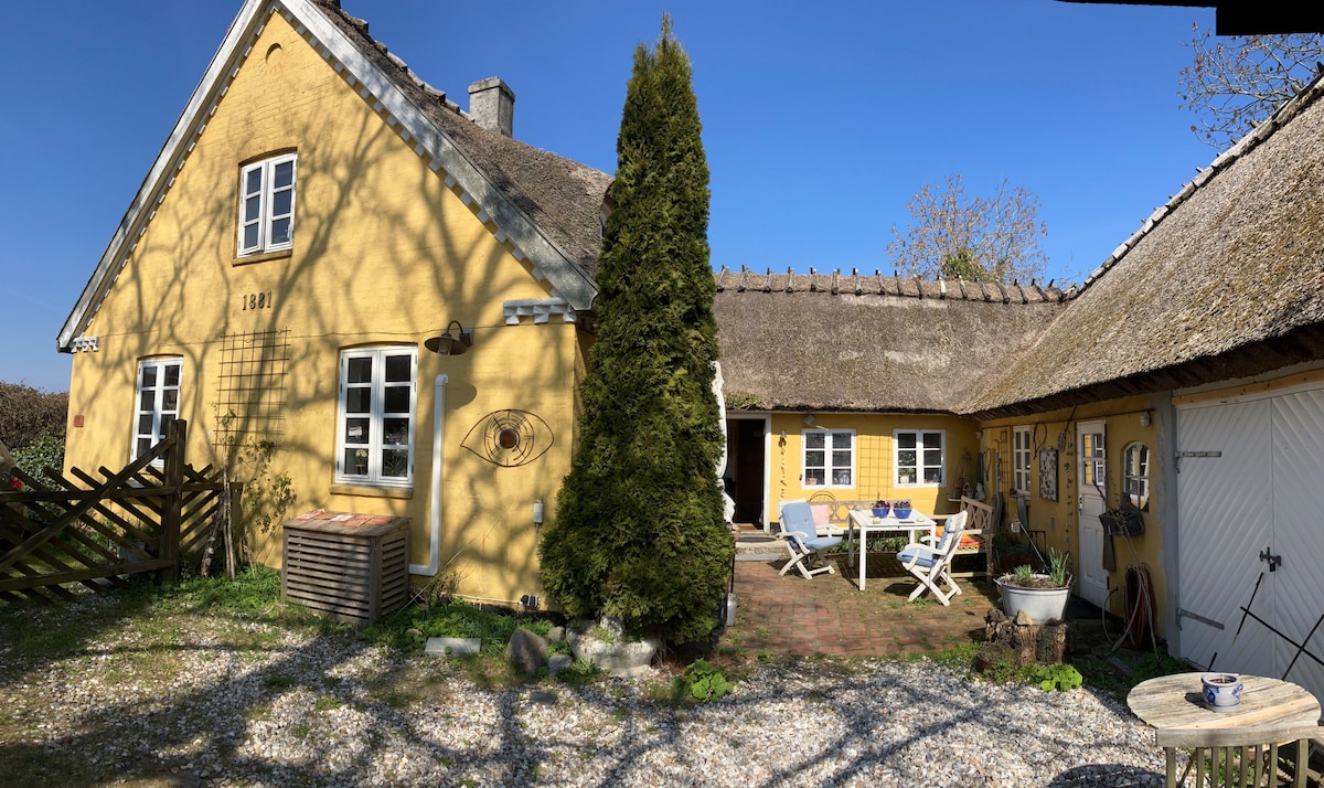 Relaxe nesta casa única e tranquila com terraço próprio e vista para o jardim e árvores de fruto apenas a uma curta distância de bicicleta até à bela praia de areia.