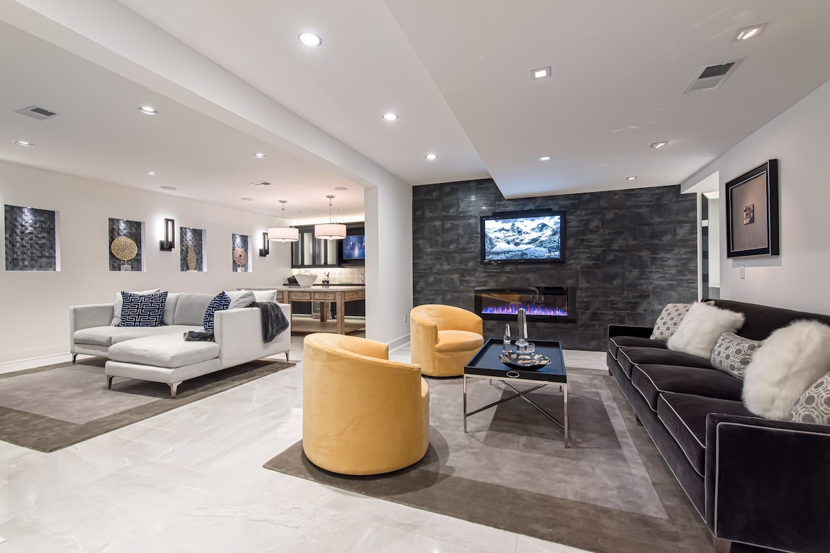 A nossa cave privada completa oferece conforto, conveniência e diversão para toda a família. Quarto queen aconchegante, um colchão de ar queen para hóspedes adicionais e até um pack-n-play para os viajantes mais pequenos. Prepare refeições rápidas ou lanches na kitchenette/bar, completa com um frigorífico/congelador de tamanho completo e micro-ondas. Para os amantes do fitness, desfrute de um ginásio/sala de musculação completo ou relaxe com uma partida amigável de pingue-pongue, jogos de arcade clássicos ou jogos de tabuleiro do armário de jogos abastecido. Duas TVs.