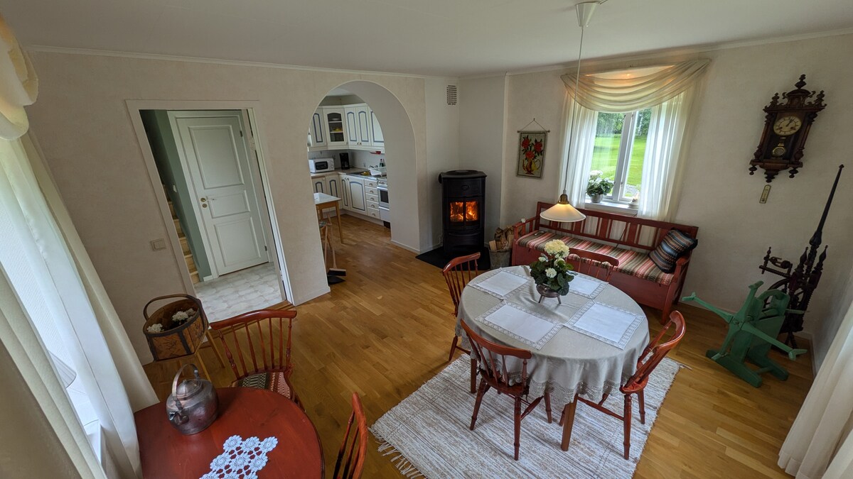 Slappna av i detta unika och lugna boende. Flytta in i den gamla skolmatsalen där kyrkans elever intog sin skollunch på dagarna på 40-50-talet. Vedspisen som sprakar i köket är densamma som matmor tillredde lunchen på. Själv bodde hon på övreplan och vi erbjuder hennes kök med intilliggande sovrum och badrum. Tyst och lugnt I den gamla timmerbyggnaden. Ute kan man njuta av fjällutsikt eller besöka Frösöns vackra kyrka som ligger intill prästgården där värdparet bor med sina hundar och katter.