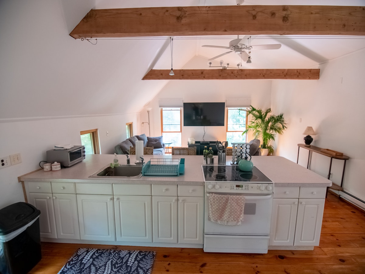 Fuja da cidade, trabalhe na natureza! Chalé totalmente privativo com vista para o jardim, ar central e pisos aquecidos. 1,6 km de praias imaculadas e centro da cidade, LIRR, Hampton Jitney, 3 grandes mercearias, Starbucks, mercado orgânico, lojas e restaurantes. Cama king, TV a cabo, geladeira com gelo, micro-ondas, churrasqueira ao ar livre, quintal privativo, perfeito para casais, solitários, 1-2 crianças pequenas. Aceitamos cães pequenos por uma taxa de US$ 100. Por favor, envie-nos uma mensagem com o tamanho e o tipo. Casal/proprietários trabalhadores na casa principal.